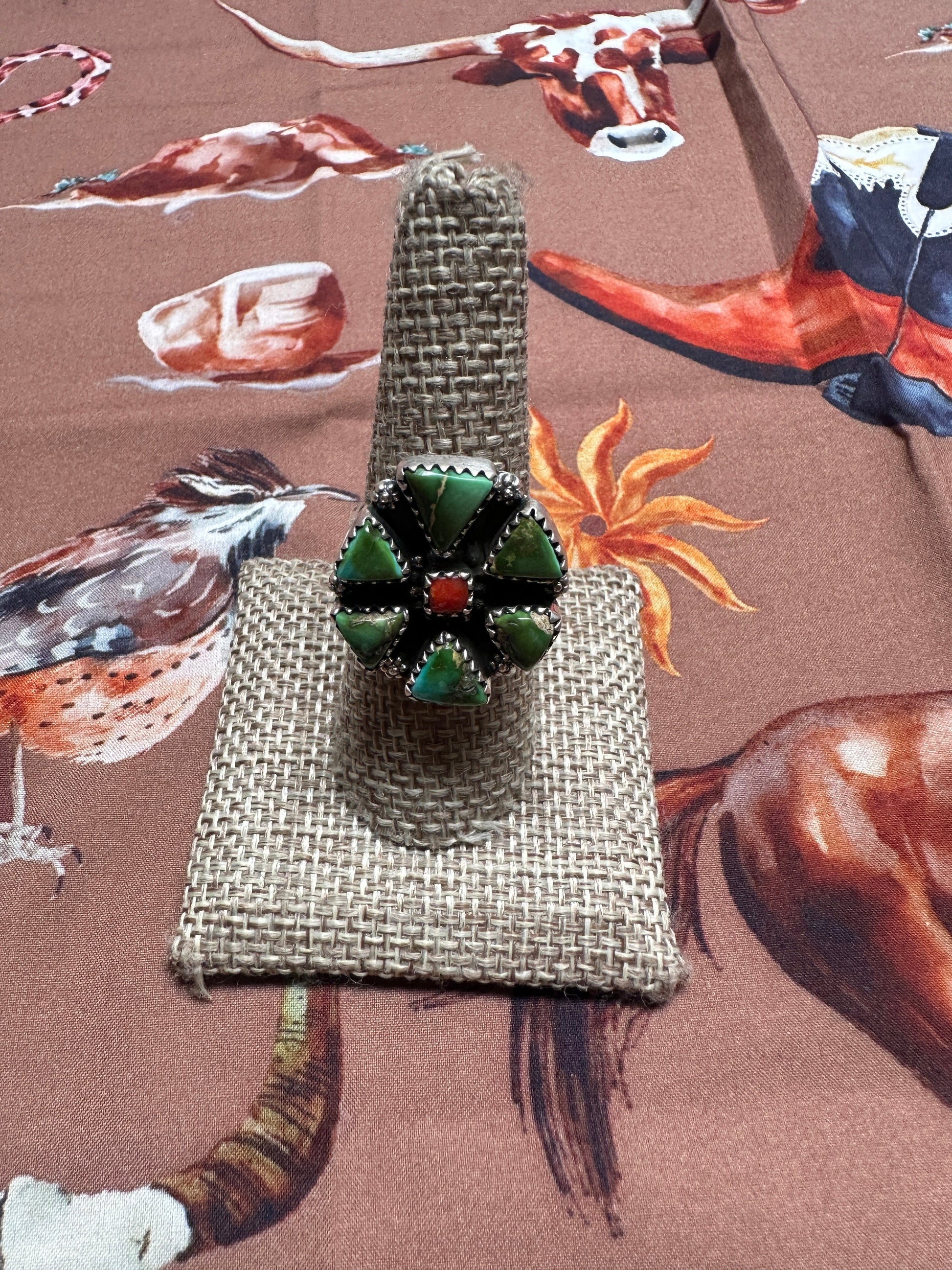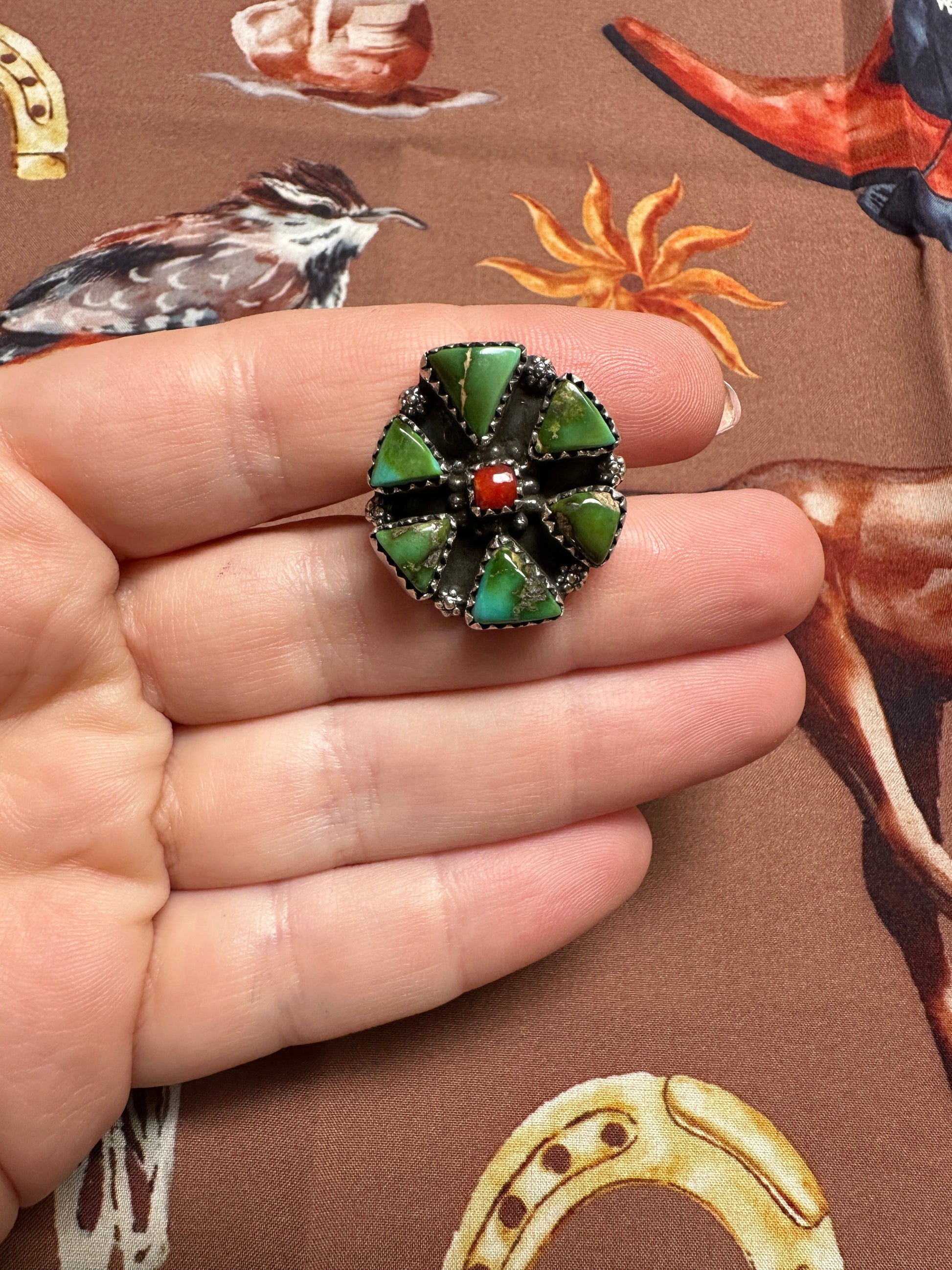 Beautiful Handmade Coral, Sonoran Turquoise And Sterling Silver Adjustable CLUSTER Ring