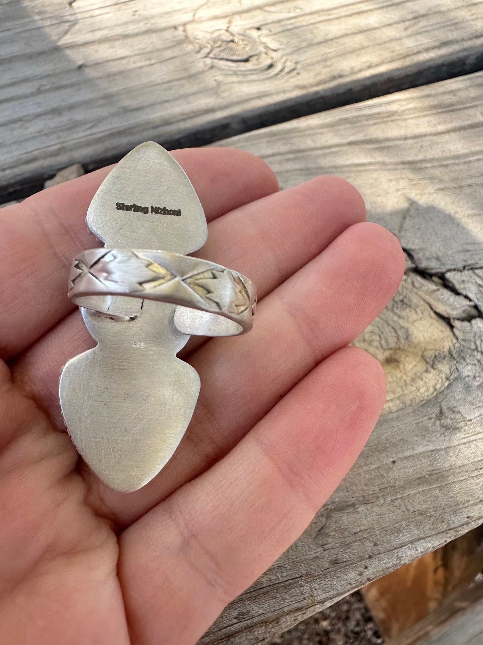 Adjustable in size to wear on any finger. Beautiful stones. Beautiful details. Really great Ring. Measuring 2 inch long and 3/4 inch wide.