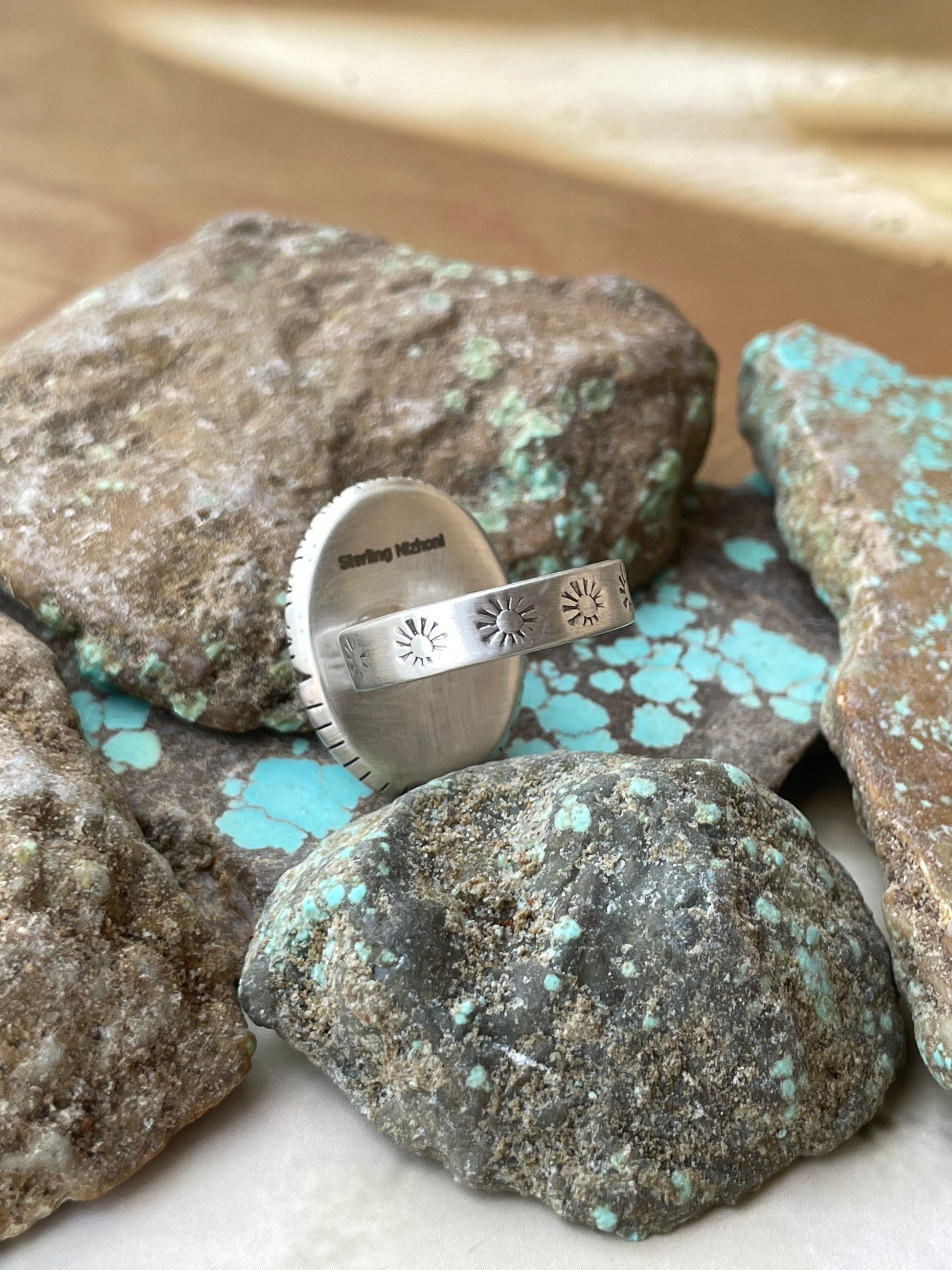 Adjustable in size to wear on any finger. Beautiful stones. Beautiful details. Really great Ring. Measuring just over 1 inch long and just under 1 inch wide.
