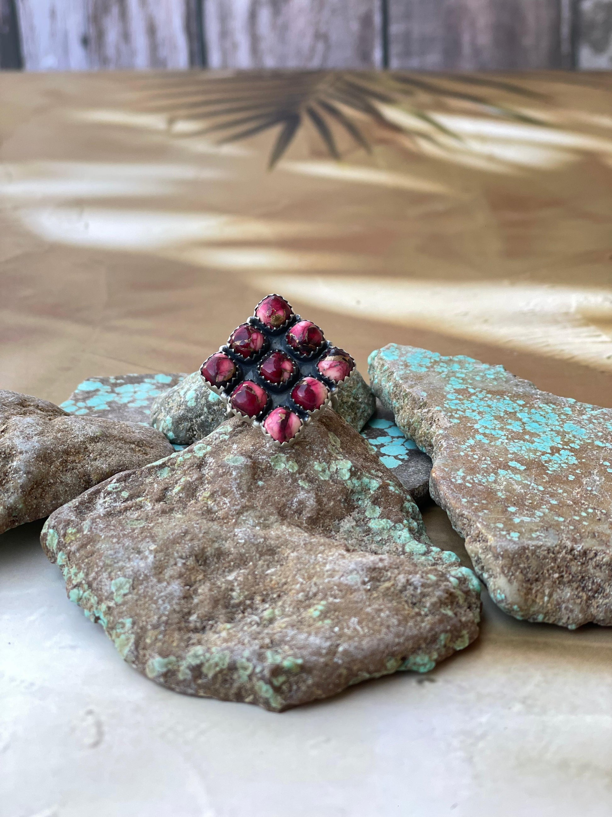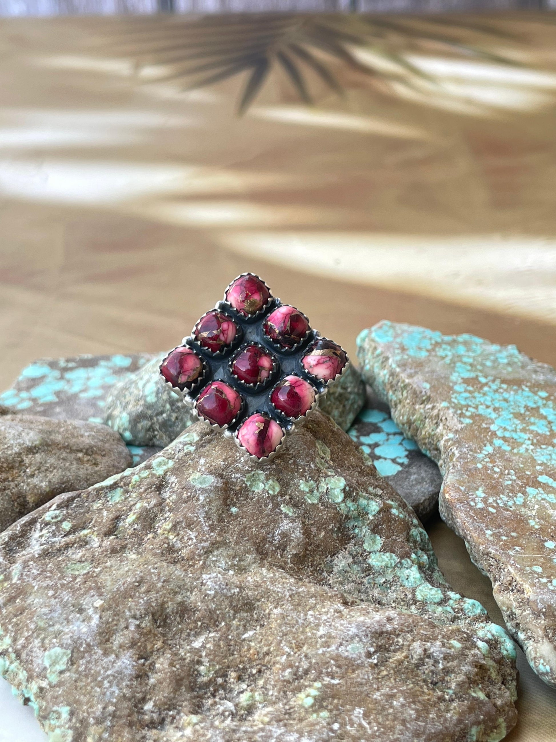 Adjustable in size to wear on any finger. Beautiful stones. Beautiful details. Really great Ring. Ring face 1 inch.