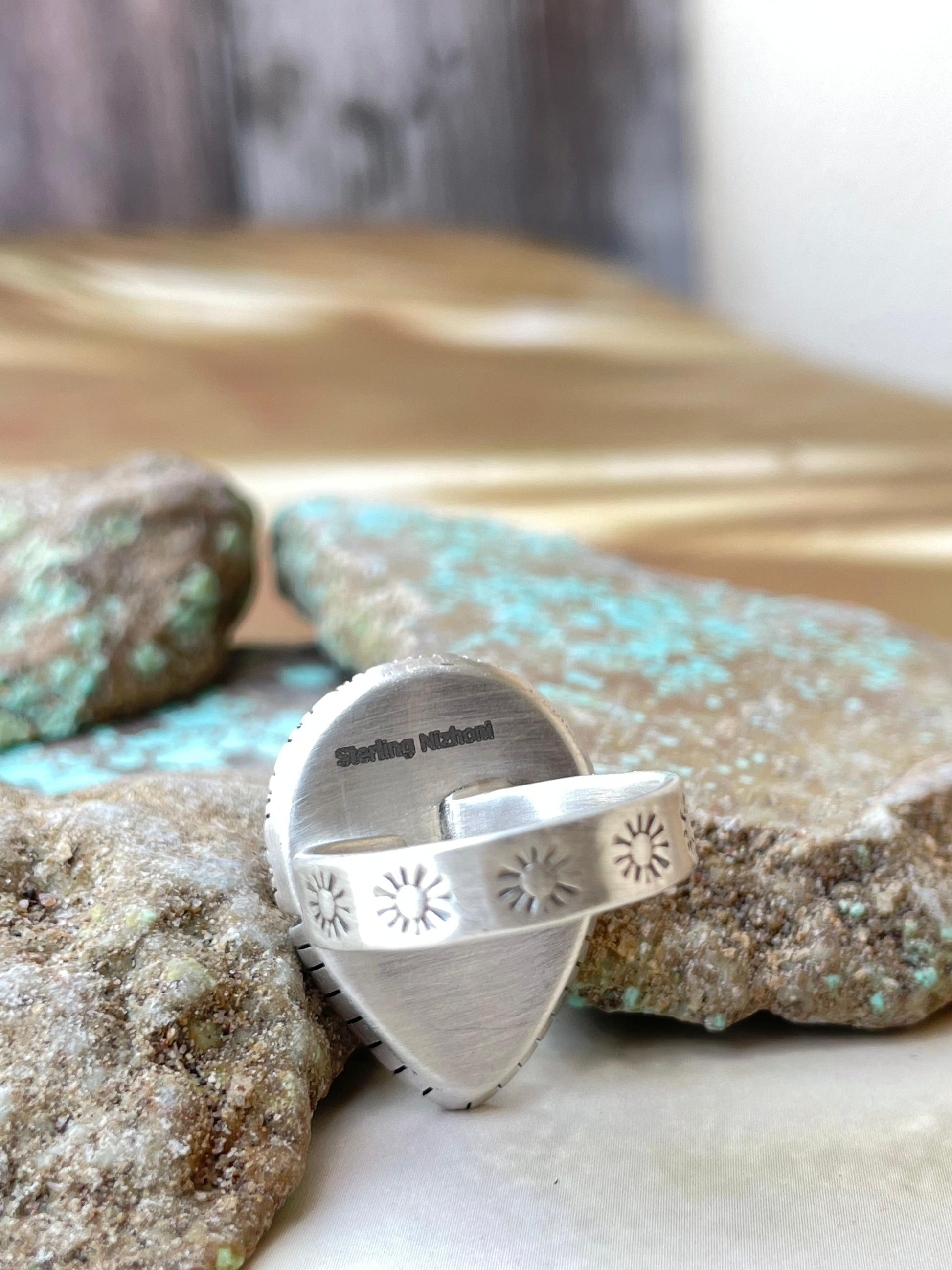 Adjustable in size to wear on any finger. Beautiful stones. Beautiful details. Really great Ring. Measuring just over 1 inch long and just under 1 inch wide.