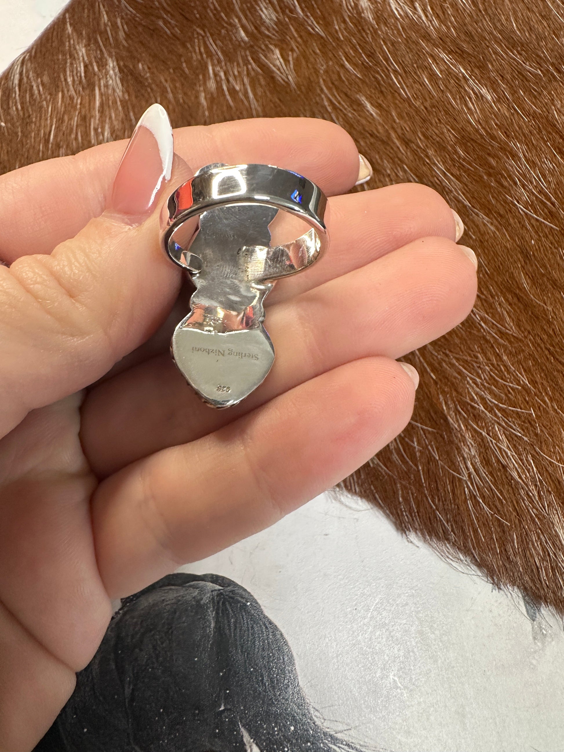 Adjustable in size to wear on any finger. Beautiful stones. Beautiful details. Really great Ring. Measuring 1 5/8 inch long and 5/8 inch wide. Signed Nizhoni and stamped Sterling.