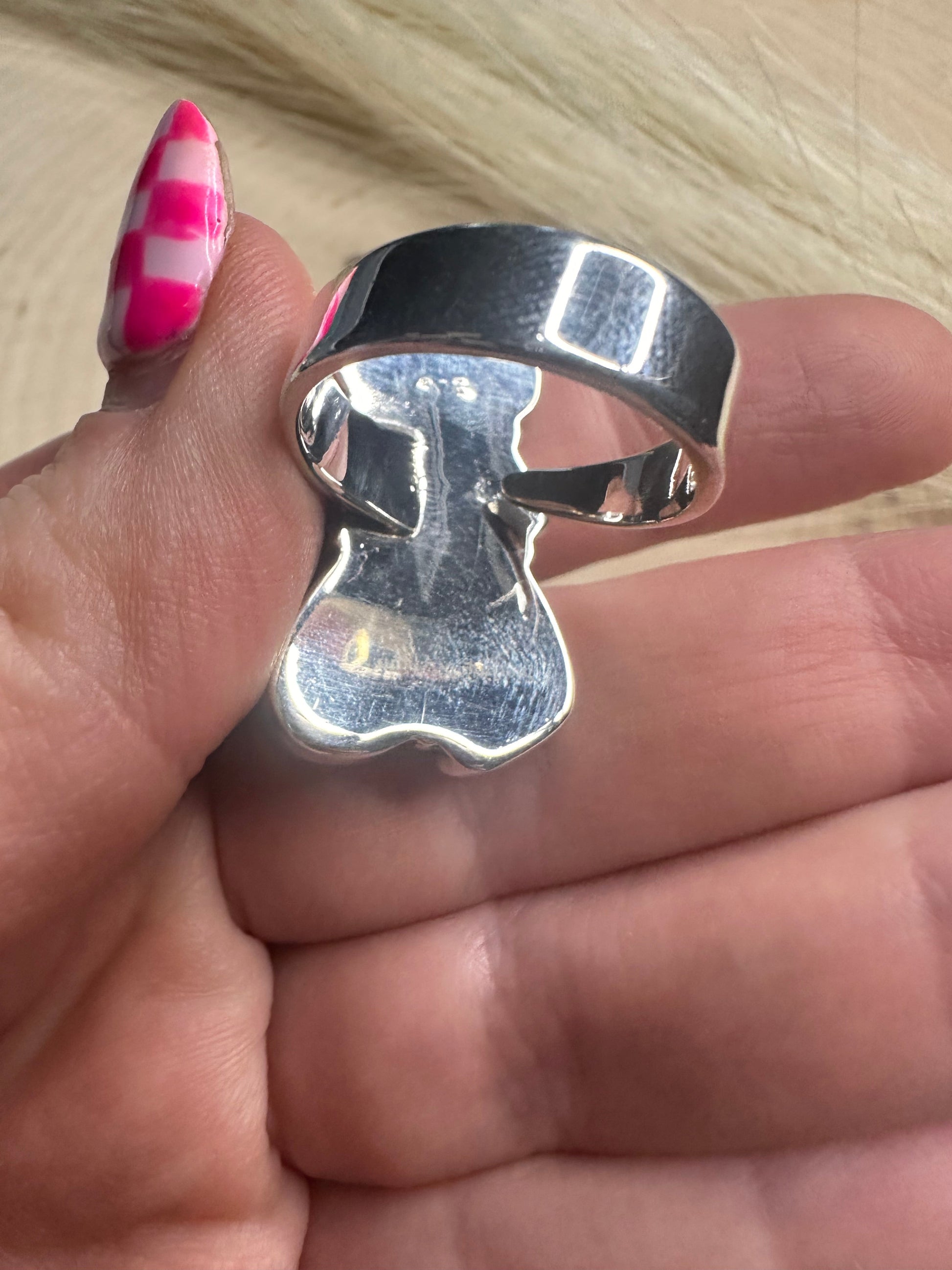Adjustable in size to wear on any finger. Beautiful stones. Beautiful details. Really great Ring. Measuring 1 3/8 inch long and 3/4 inch wide . Signed Nizhoni and stamped Sterling.