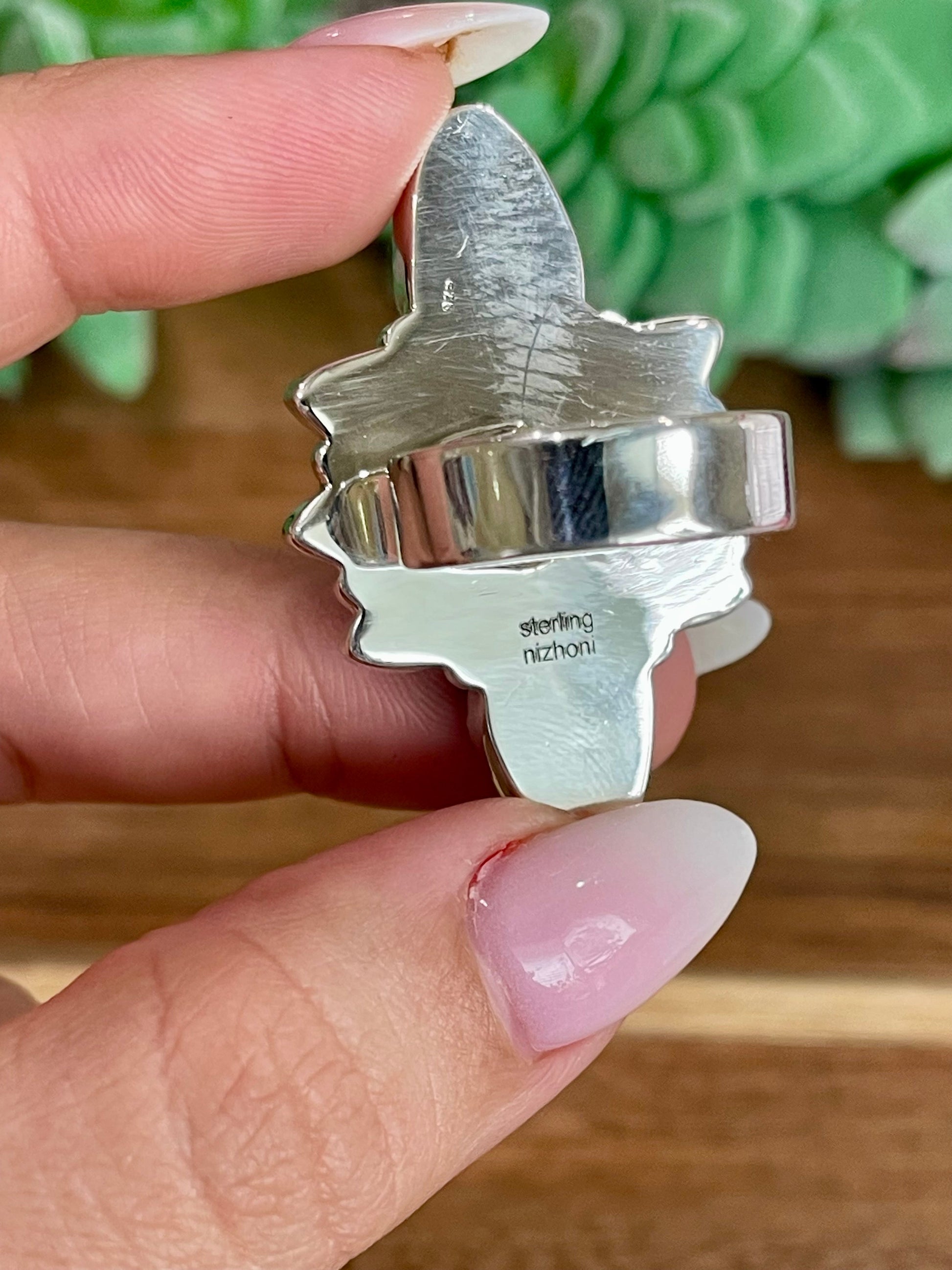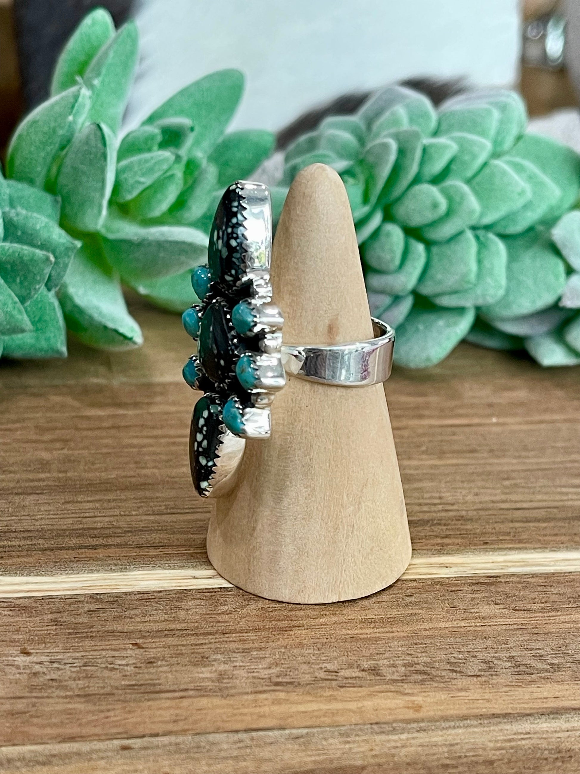 Gorgeous Handmade New Lander Turquoise, Turquoise And Sterling Silver ring. Adjustable in size to wear on any finger. Beautiful stones. Beautiful details. Really great Ring. Measuring 1 3/4 inches long and about 1 1/8 inches wide . Signed Nizhoni and stamped Sterling.