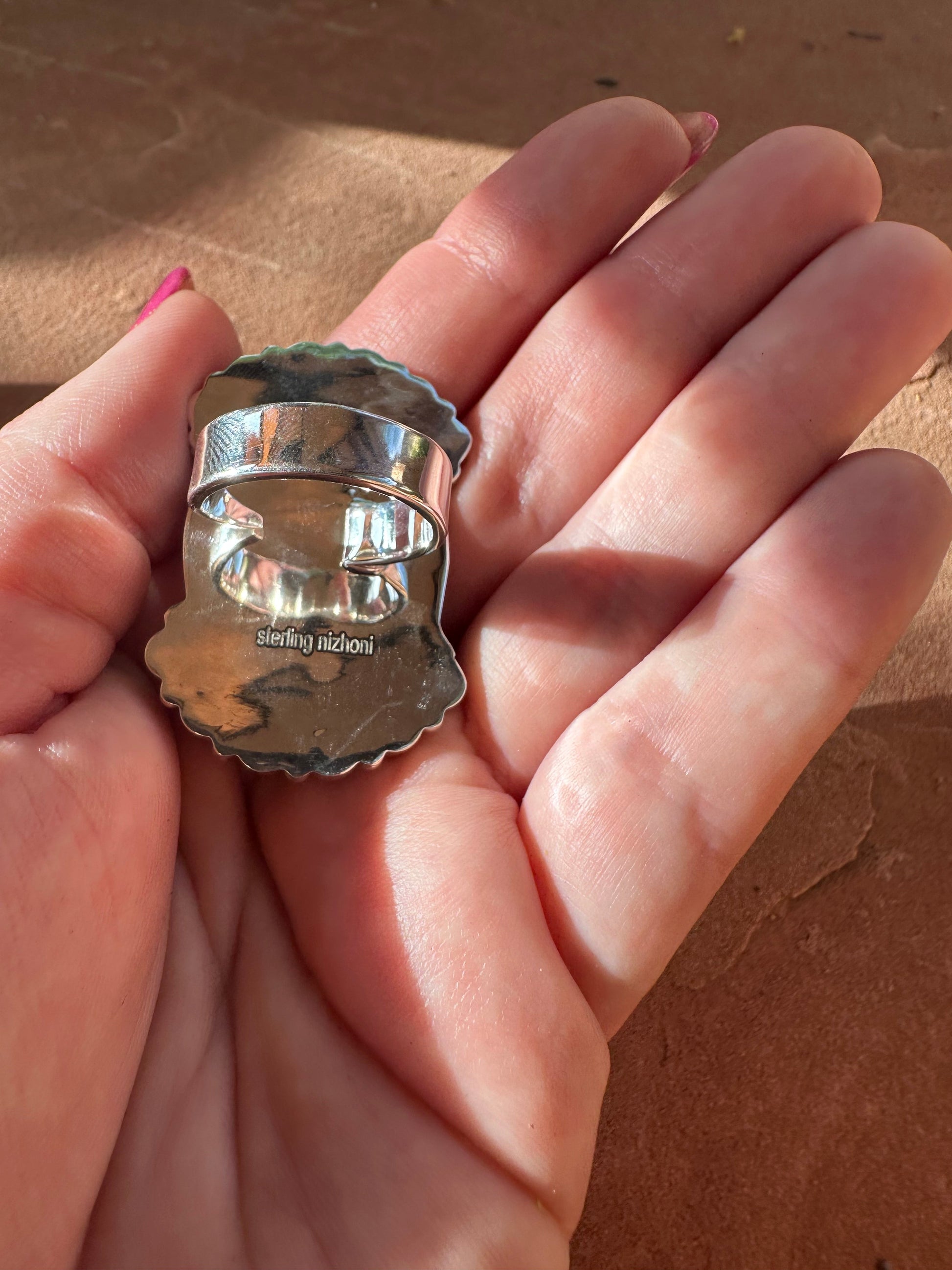 Adjustable in size to wear on any finger. Beautiful stones. Beautiful details. Really great Ring. Measuring 1 3/4 inch long and 1 1/4 inch wide.