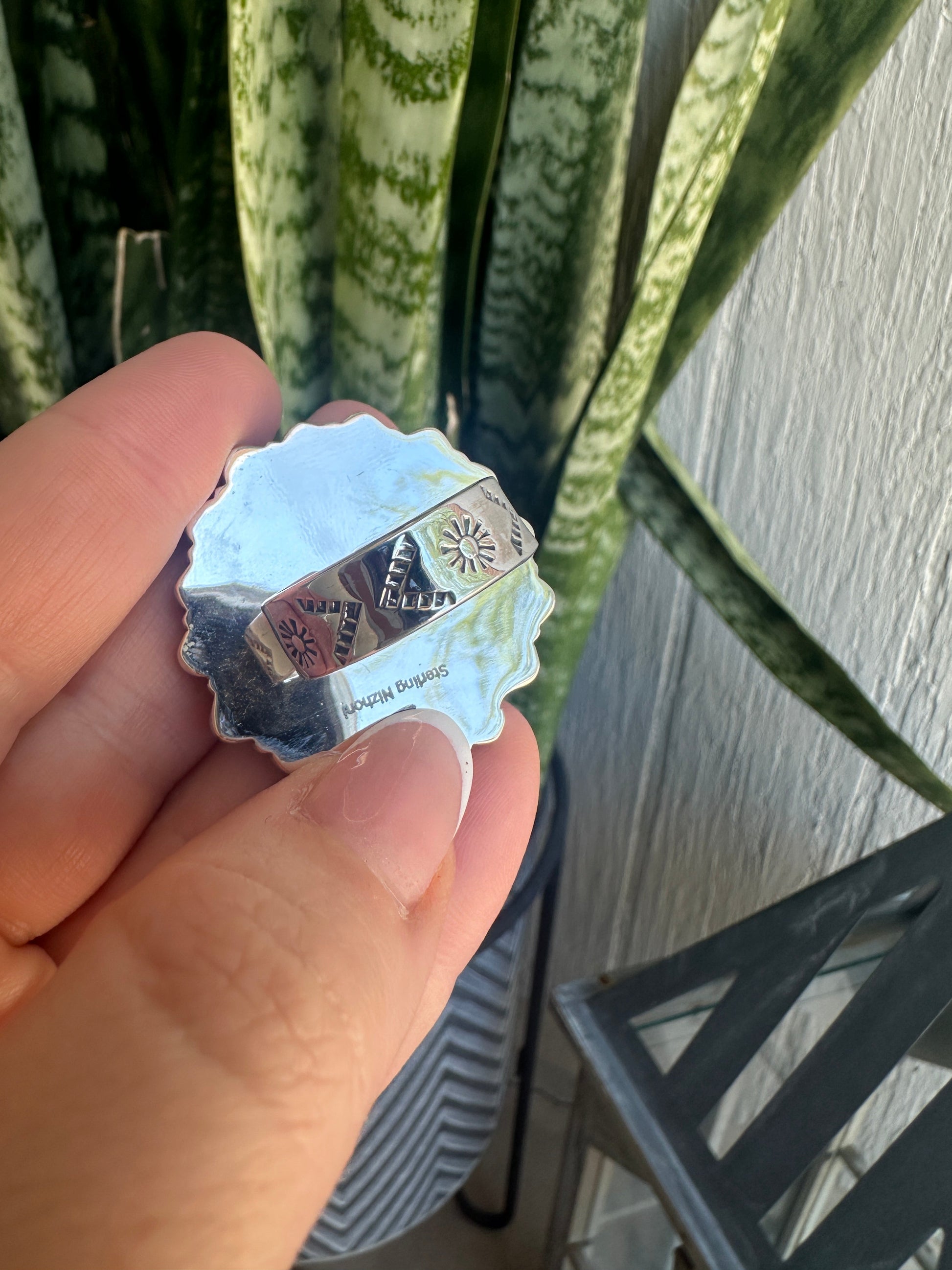 Gorgeous Handmade Onyx, Spice And Sterling Silver ring. Adjustable in size to wear on any finger. Beautiful stones. Beautiful details. Really great Ring. Measuring 1.5 inch long and 1.5 inch wide . Signed Nizhoni and stamped Sterling.
