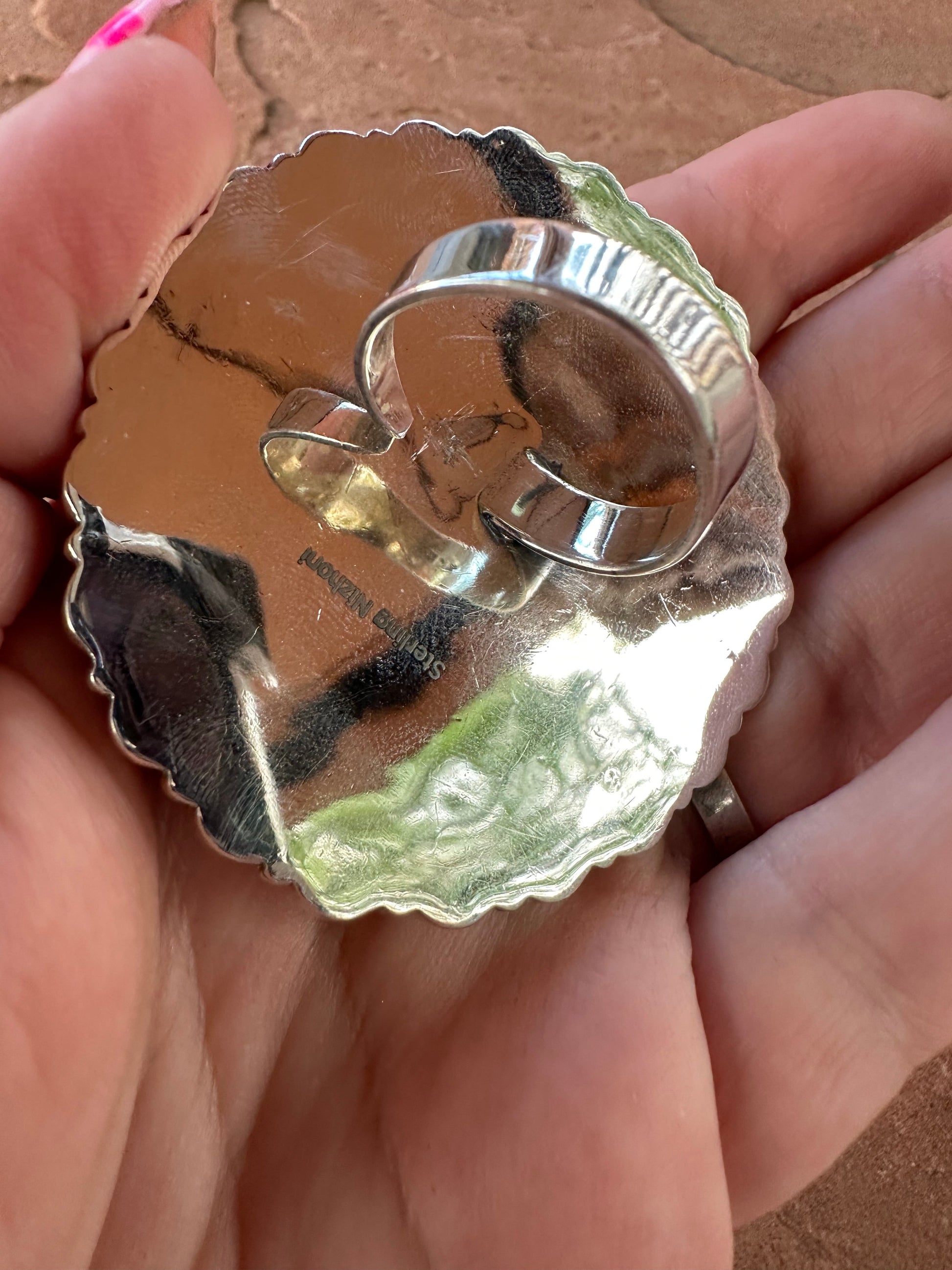 Gorgeous Handmade Orange Mojave, Lapis And Sterling Silver ring. Adjustable in size to wear on any finger. Beautiful stones. Beautiful details. Really great Ring. Measuring 2 1/4 inches long and 2 inches wide . Signed Nizhoni and stamped Sterling.