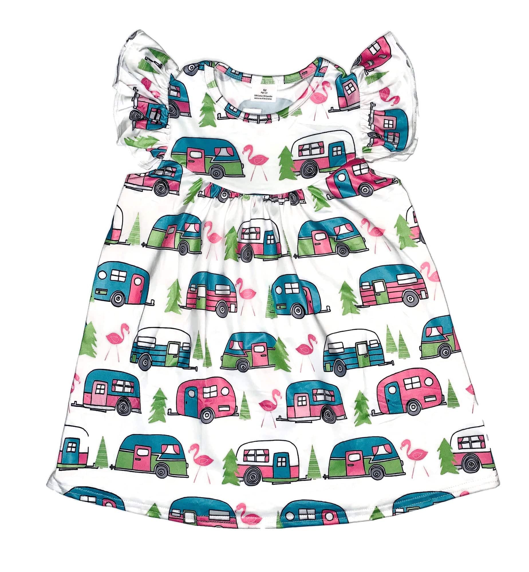 This pink and teal camper milk silk flutter dress is adorable! Made out of Milk Silk which is 95% Cotton and 5% Spandex not only is this dress ultra comfortable but it is also Wrinkle Free!