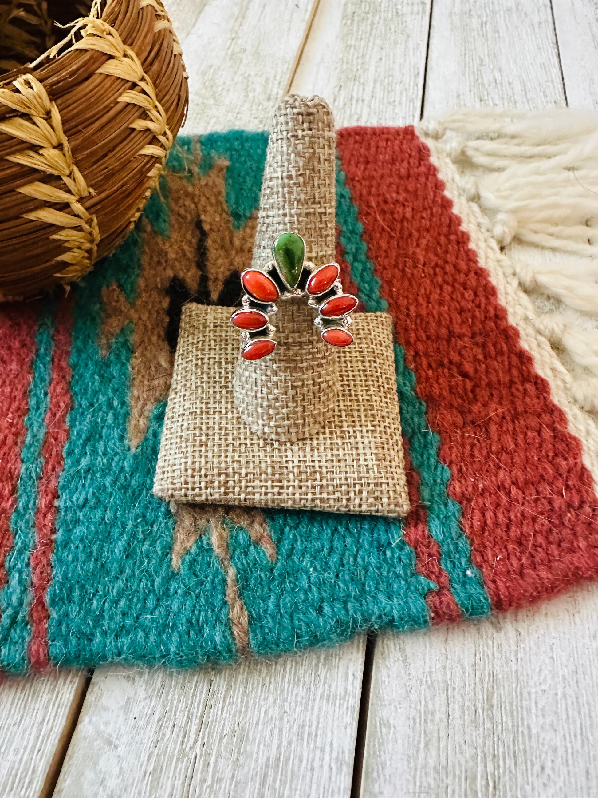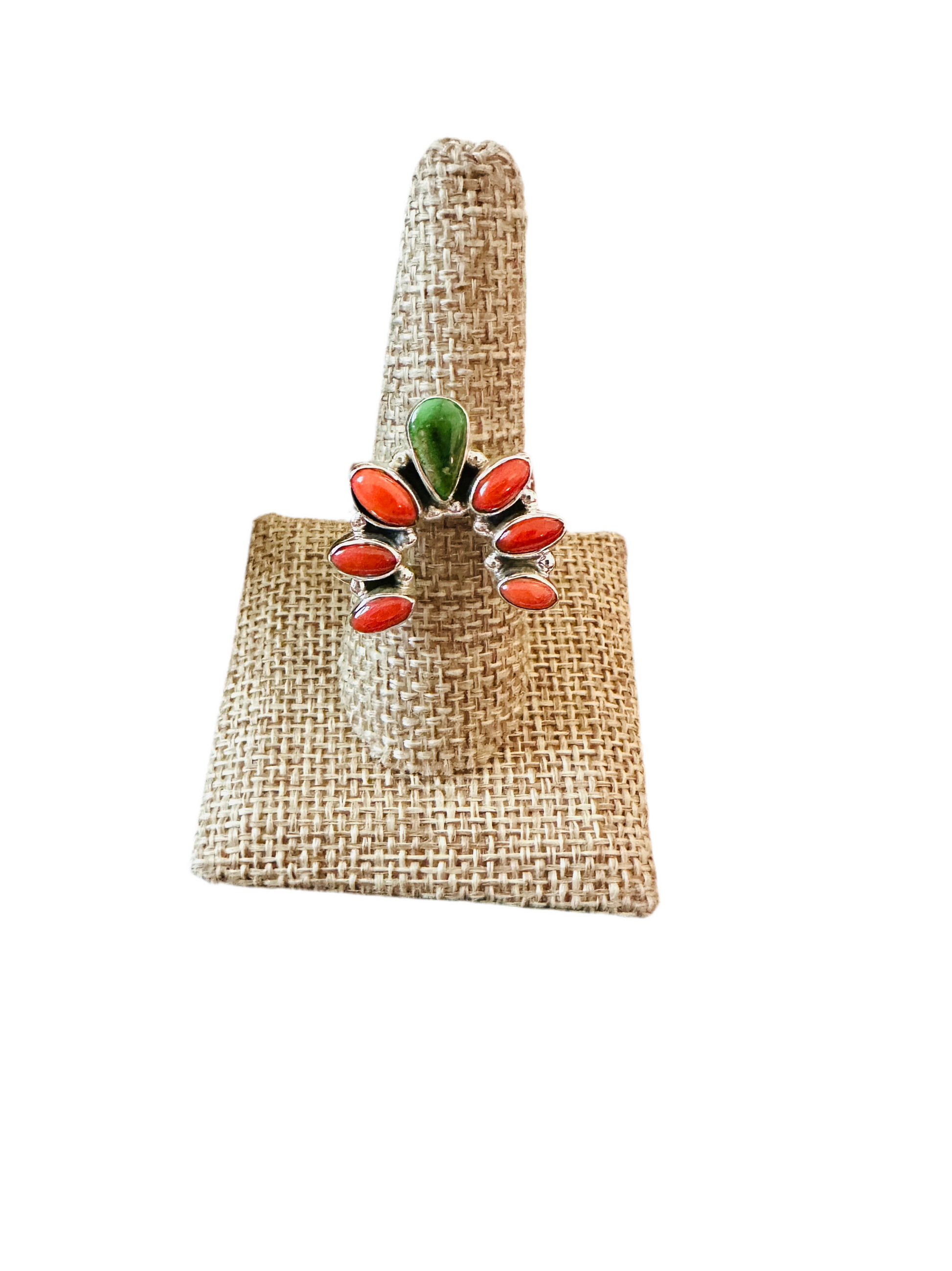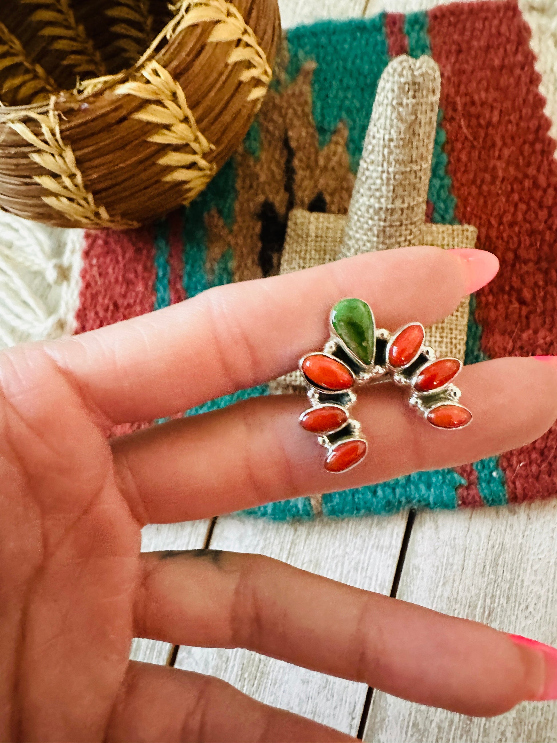 ** Christmas Collection ** Handmade Sterling Silver, Turquoise & Coral Adjustable Ring Signed Nizhoni