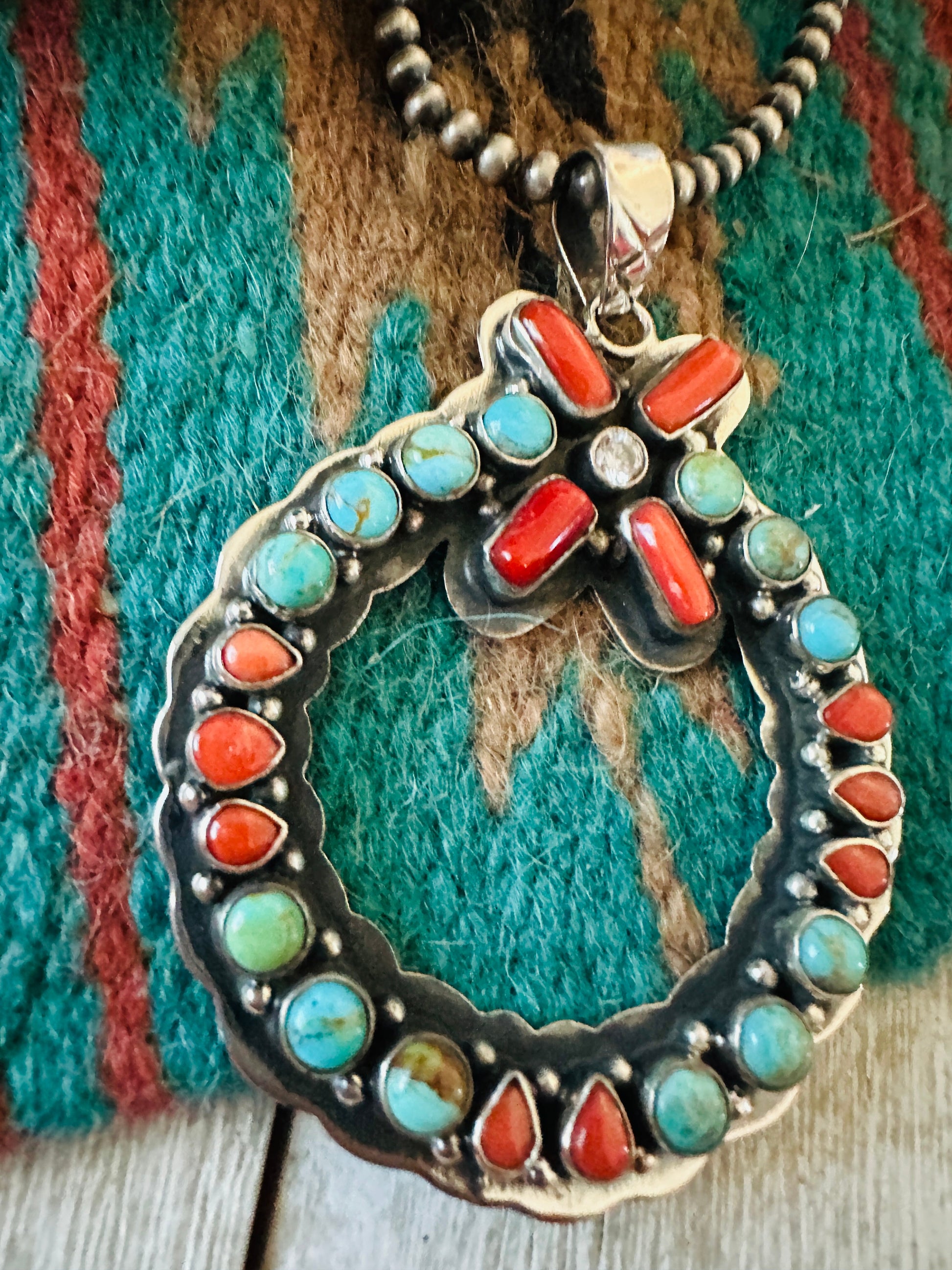 ** Christmas Collection ** Handmade Sterling Silver, Turquoise, Coral & CZ Wreath Pendant Signed Nizhoni