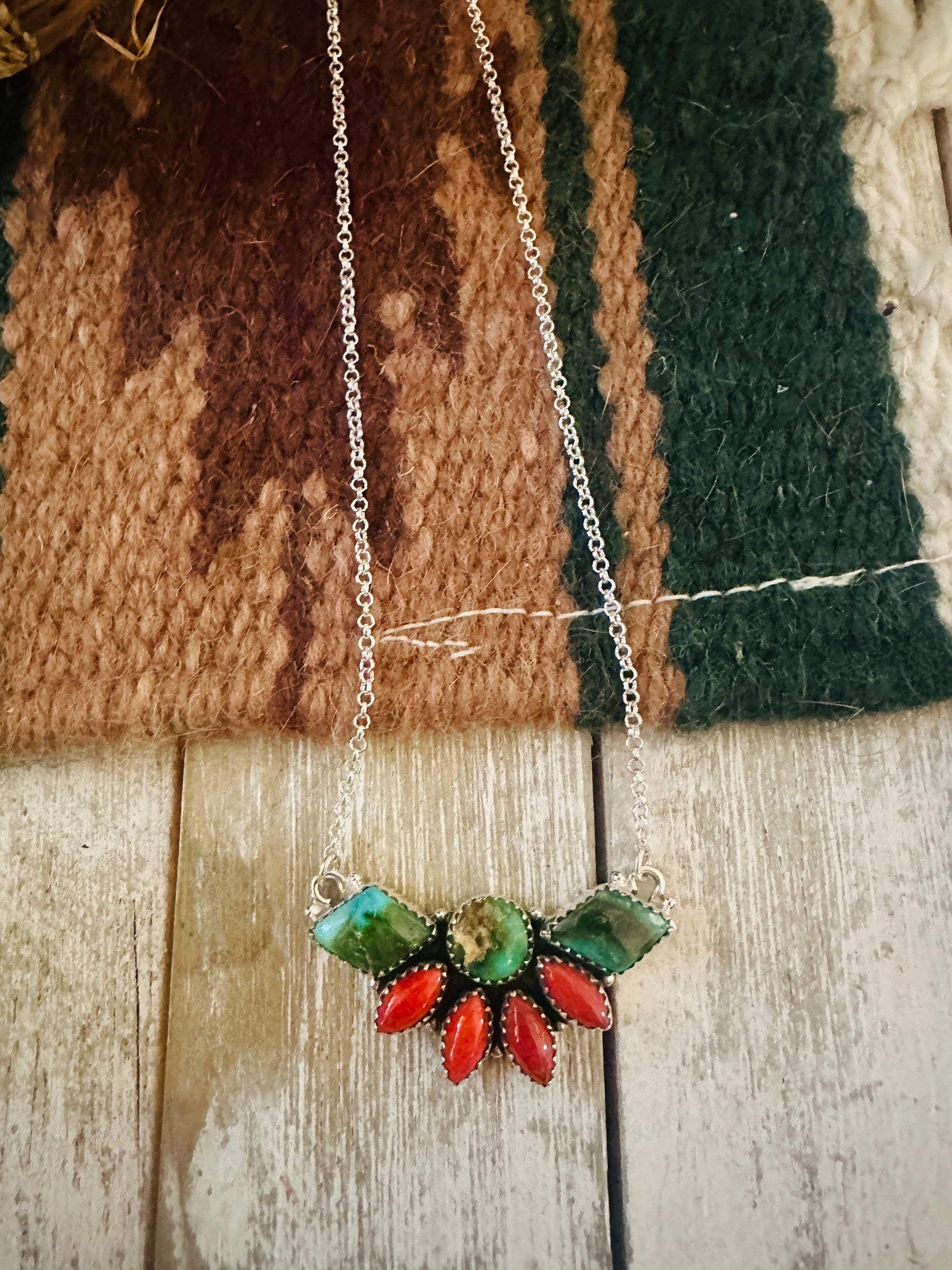 ** Christmas Collection ** Handmade Sterling Silver, Turquoise & Coral Necklace Signed Nizhoni