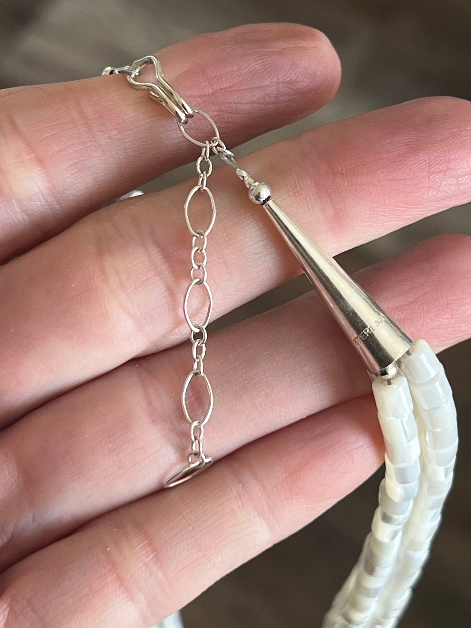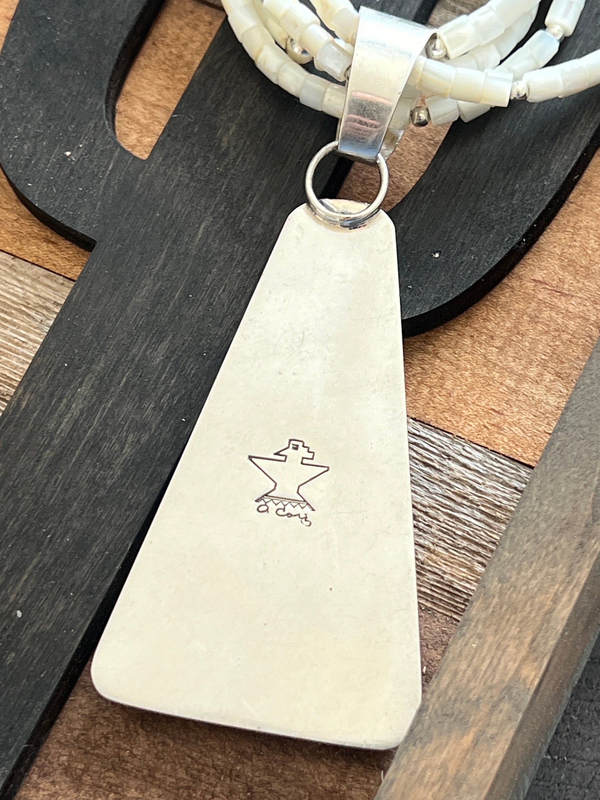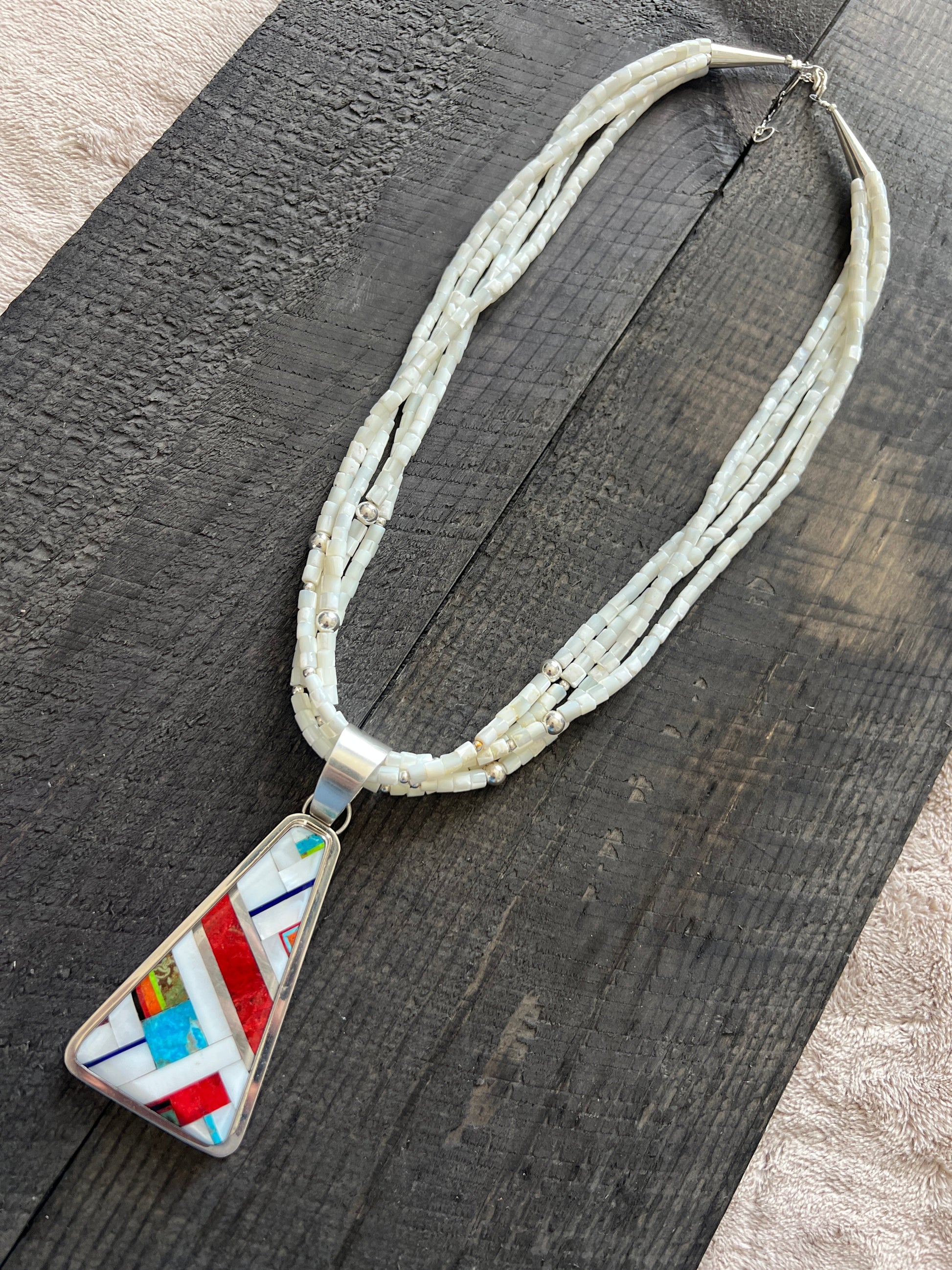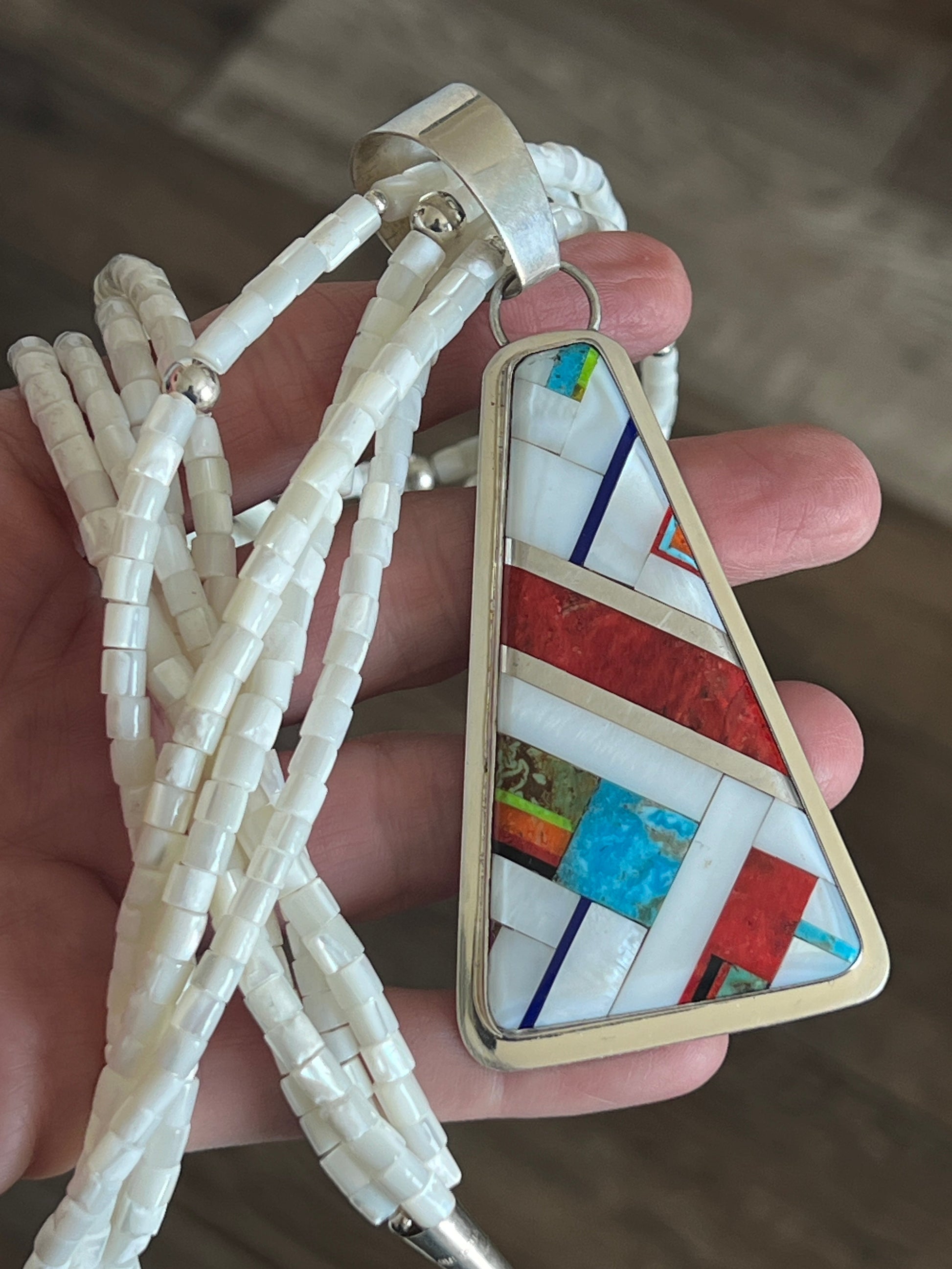 This beautiful Daniel Coriz necklace is a 4 strand Mother of Pearl and Sterling Silver piece with a gorgeous multi-stone inlay pendant. The necklace measures 23 + 2 inches long, and the pendant is 4 inches long. The necklace is signed and stamped by Daniel Coriz.