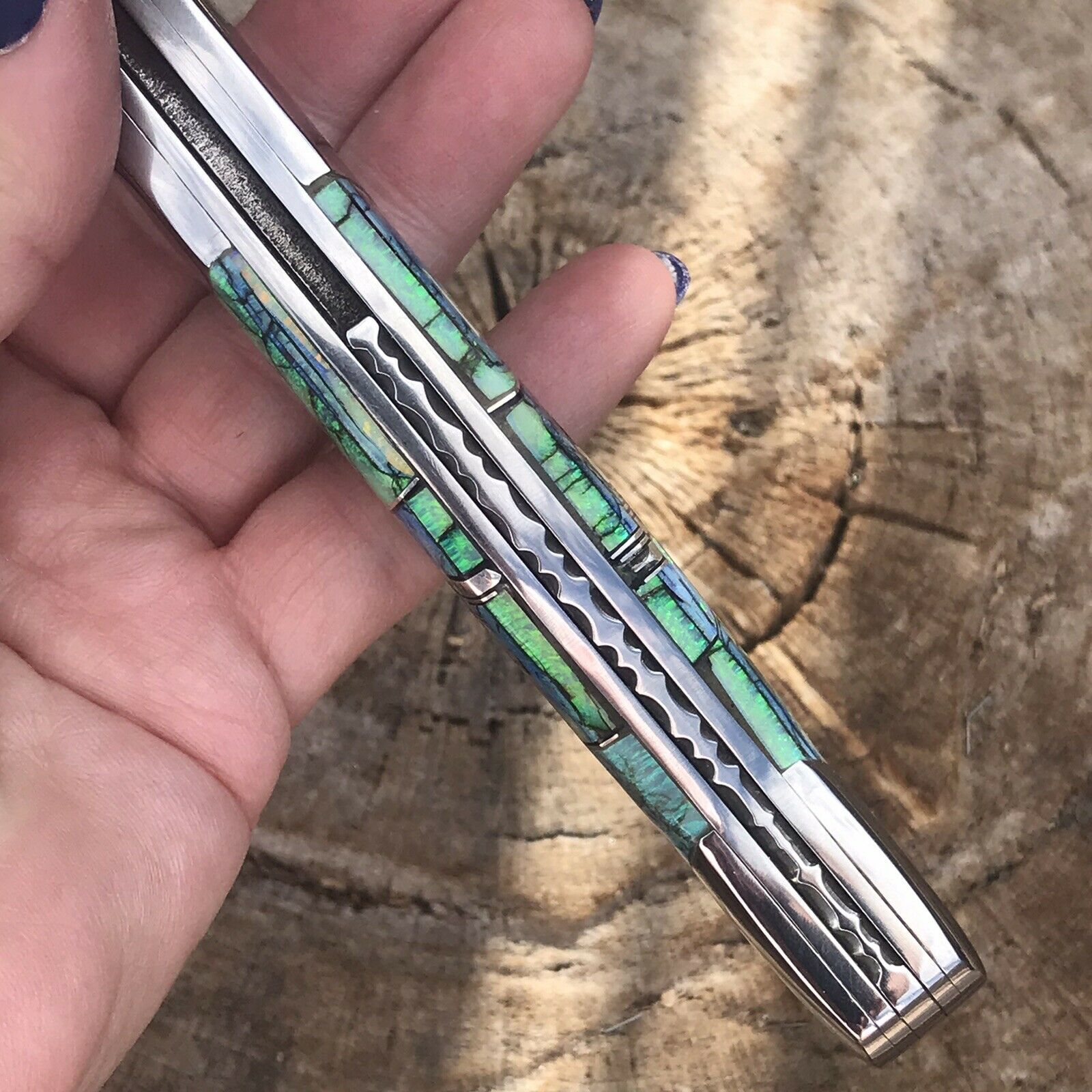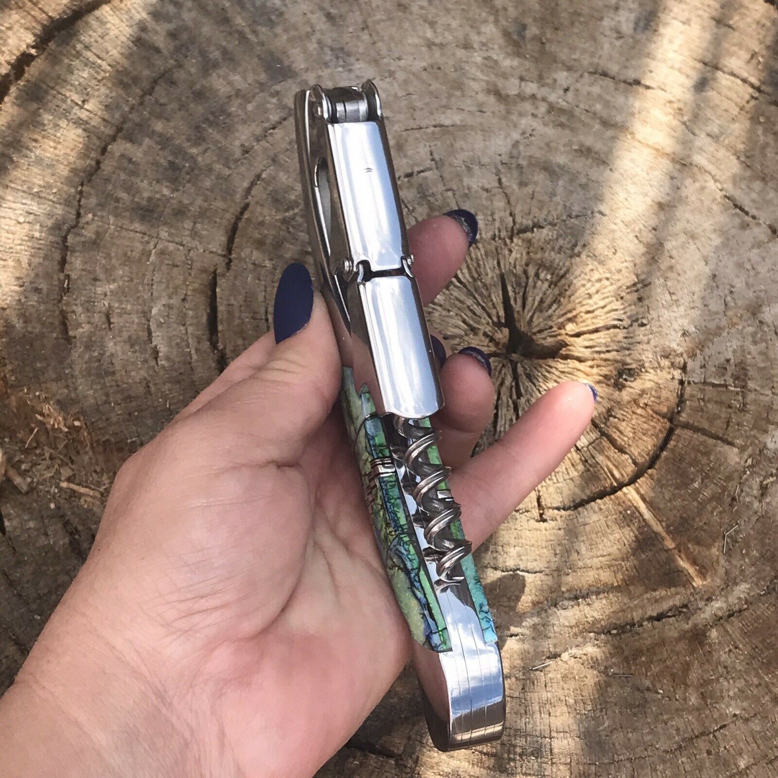 Southwestern Style Steel Multi Tool Wine Opener. Measuring 6 inches long folded.. Stunning colors in the Fire Opal Stone Inlay Handle. The perfect gift for the person who has everything.