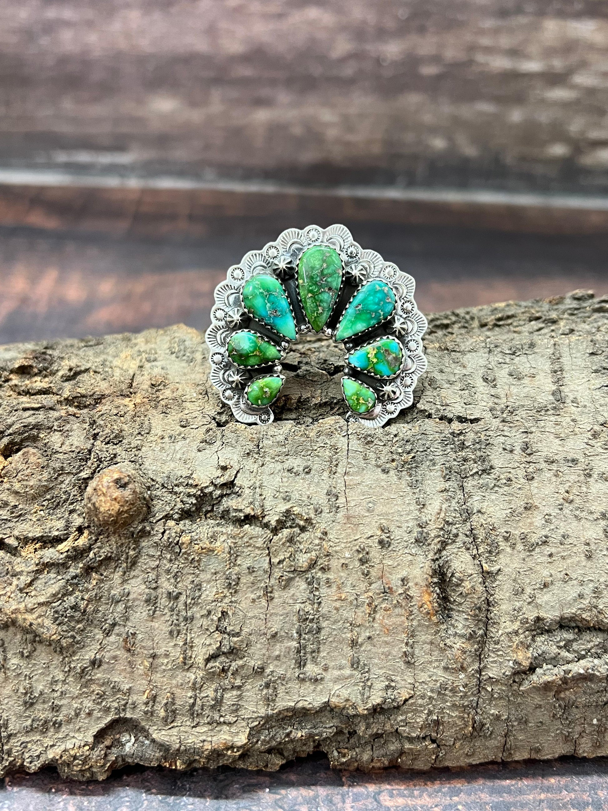 Introducing our latest masterpiece! This stunning Sterling Silver Sonoran Mountain Turquoise adjustable ring is a true showstopper. With dimensions of 1 5/8" in length and 1 5/8" in width, it’s designed to make a bold statement.