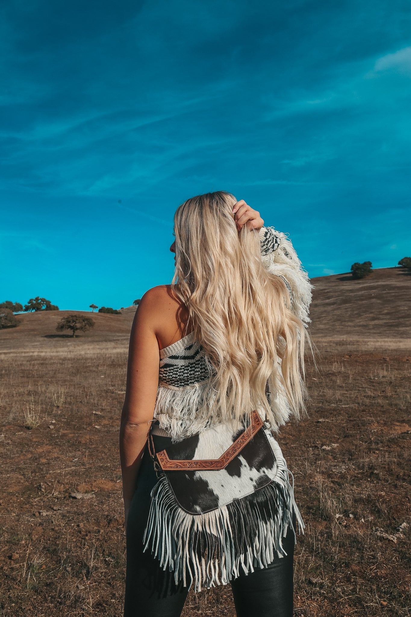 A wild little leather and hairon bag that’s sweet to look at and very soft to touch. Its fringe design gives it a unique personality while the front flap keeps your things safe. The interior contains 10 card holder slots and one zipper wallet.
