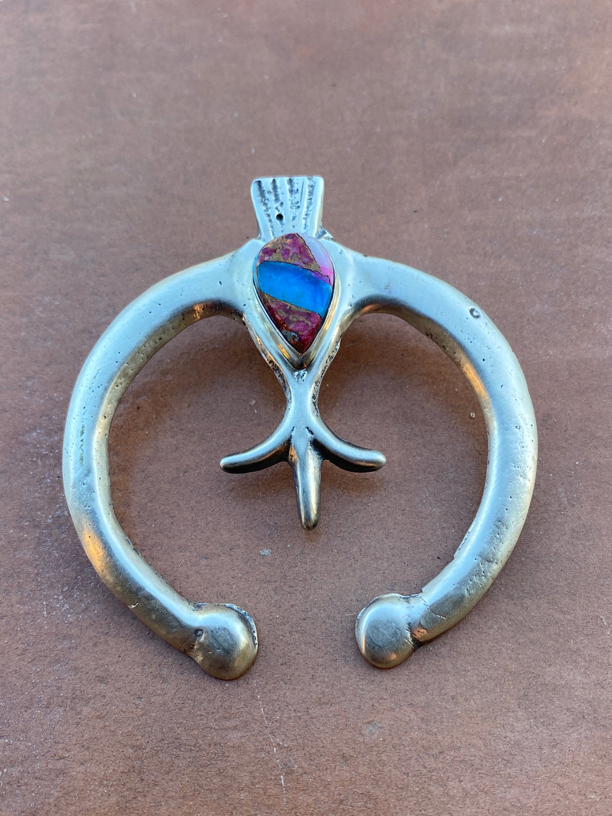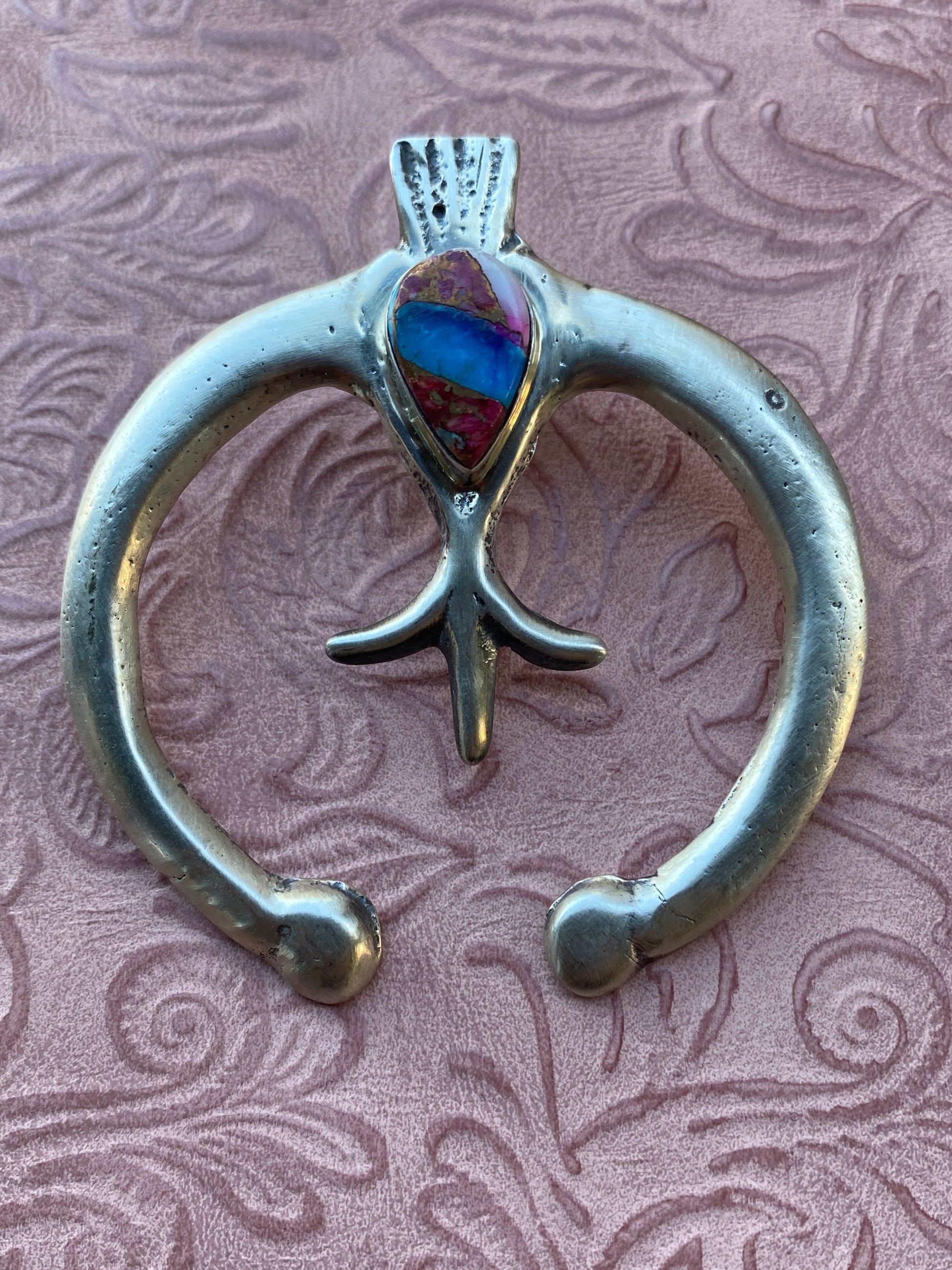 This wonderful Navajo Pink Dream Mojave & Sterling Silver Naja Pendant is amazing. It measures 2 inches long and 2 1/4 inches wide. Weight 22 grams. Beautiful Hand Stamped Workmanship. Stamped Sterling. Perfect for your favorite chain or beads.