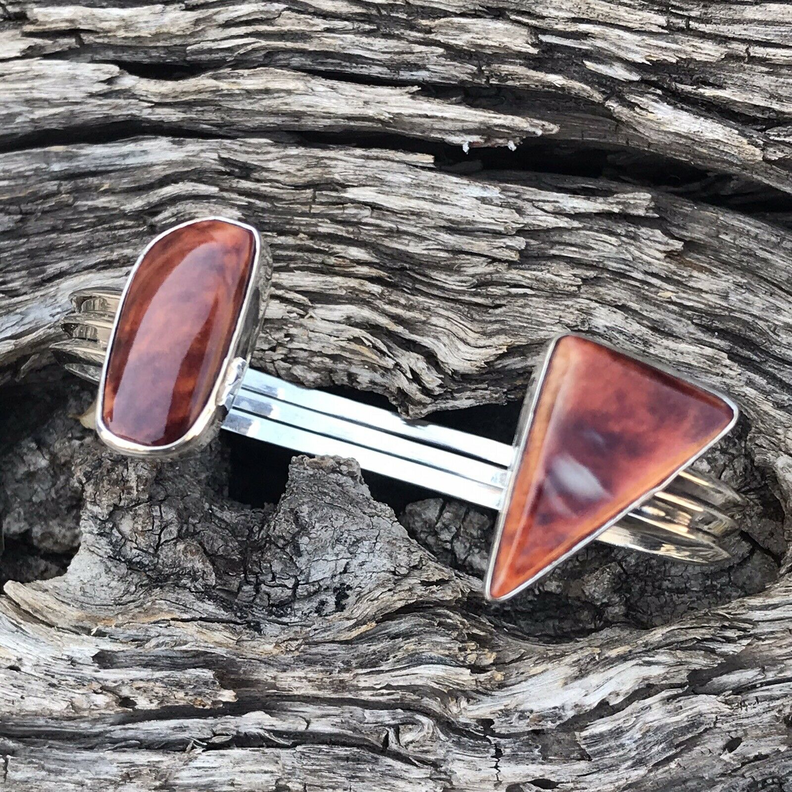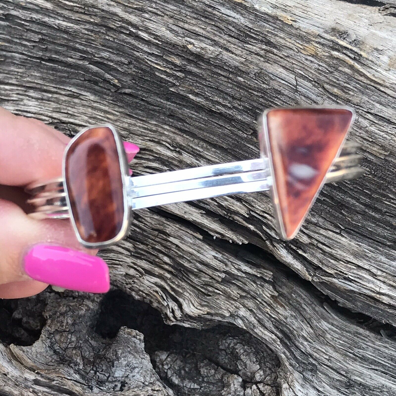 Loving this Floating Stone Bracelet Cuff. Sleek Modern Style. Sterling Silver Spiny Oyster. Deep Rich Color. Inside circumference is 5 1/2 inches with an adjustable 1inch gap. Signed by Artist and stamped Sterling . Beautiful by itself or stacked with your own favorites.
