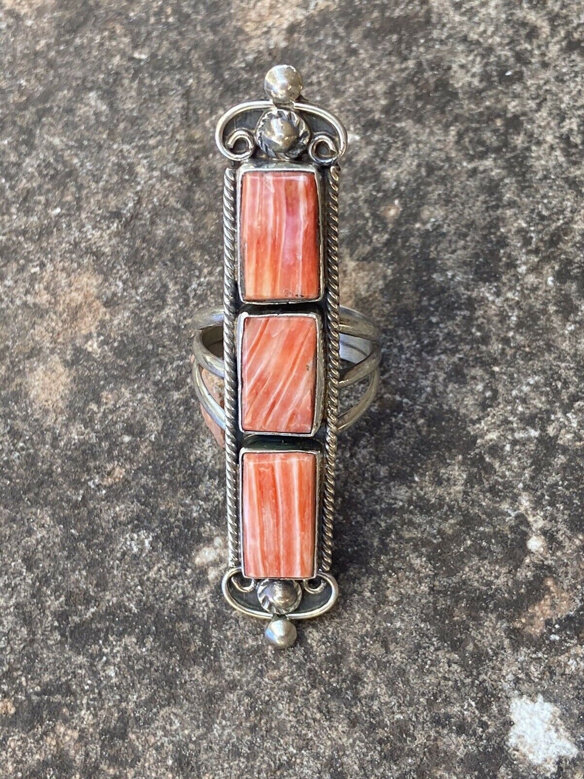 Navajo Sterling Silver & Spiny Oyster Ring. Sz 8.5. Measuring 1/2 of an inch wide and 2 1/2 inches long. Stamped Sterling & Signed by Artist