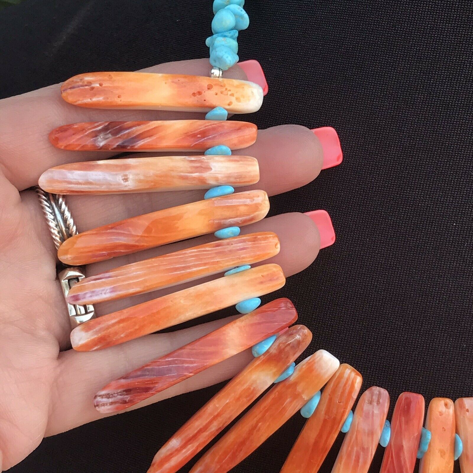 Navajo Sterling Turquoise Spiny Oyster Necklace. These colors are amazing! Bright Turquoise Stones with Vibrant Orange Spiny Oyster Accents. Gorgeous necklace. Measuring 20 to 26 inches long (adjustable chain). Great piece for your collection. Just imagine this on a crisp white blouse! Gorgeous. Due to nature of natural stones may have variations.