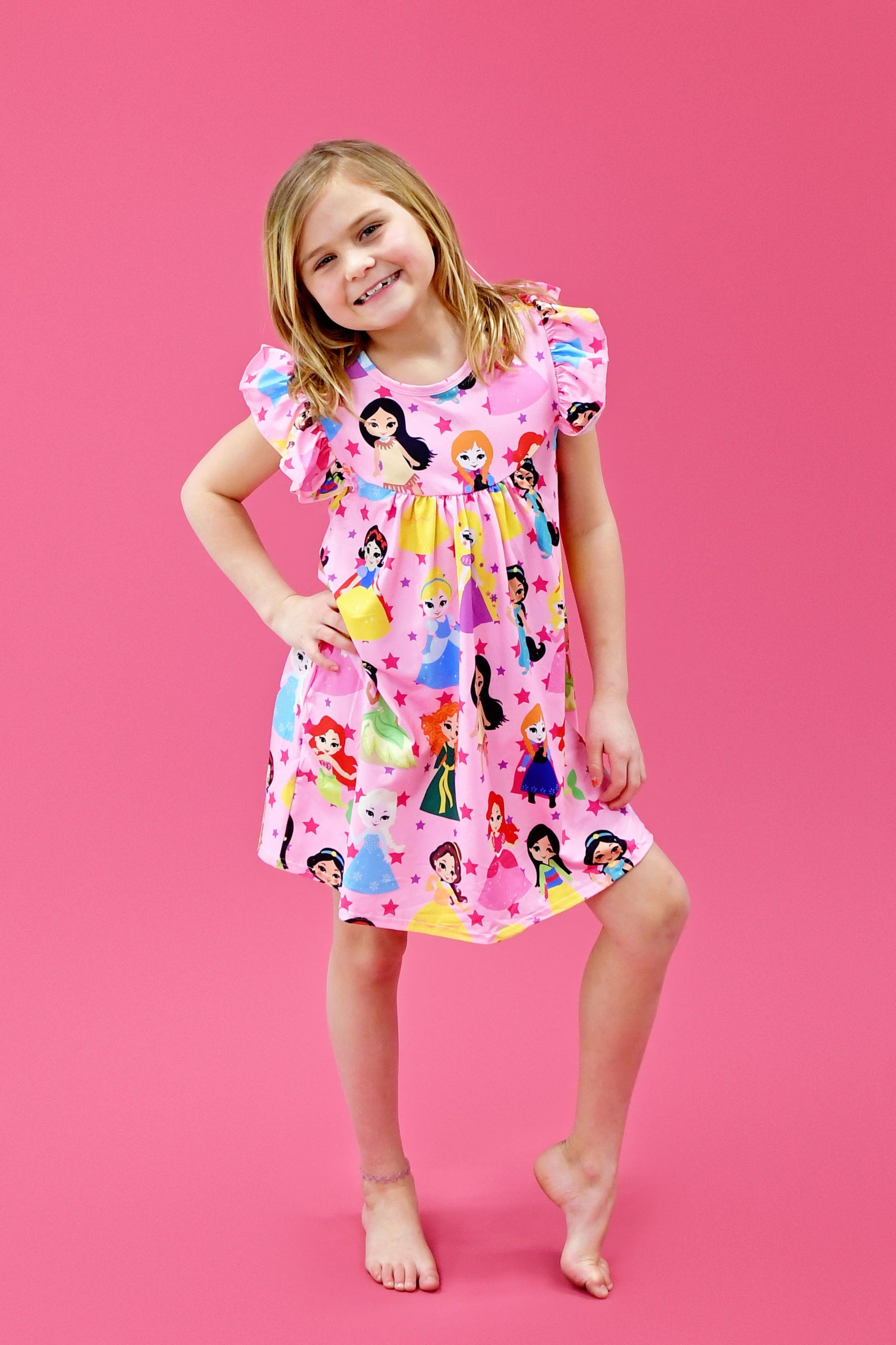This adorable dress has lots of princesses on it which makes it a fun dress for any day for your princess lover!! Made out of Milk Silk which is 95% Cotton and 5% Spandex not only is this dress ultra comfortable but it is also Wrinkle Free!