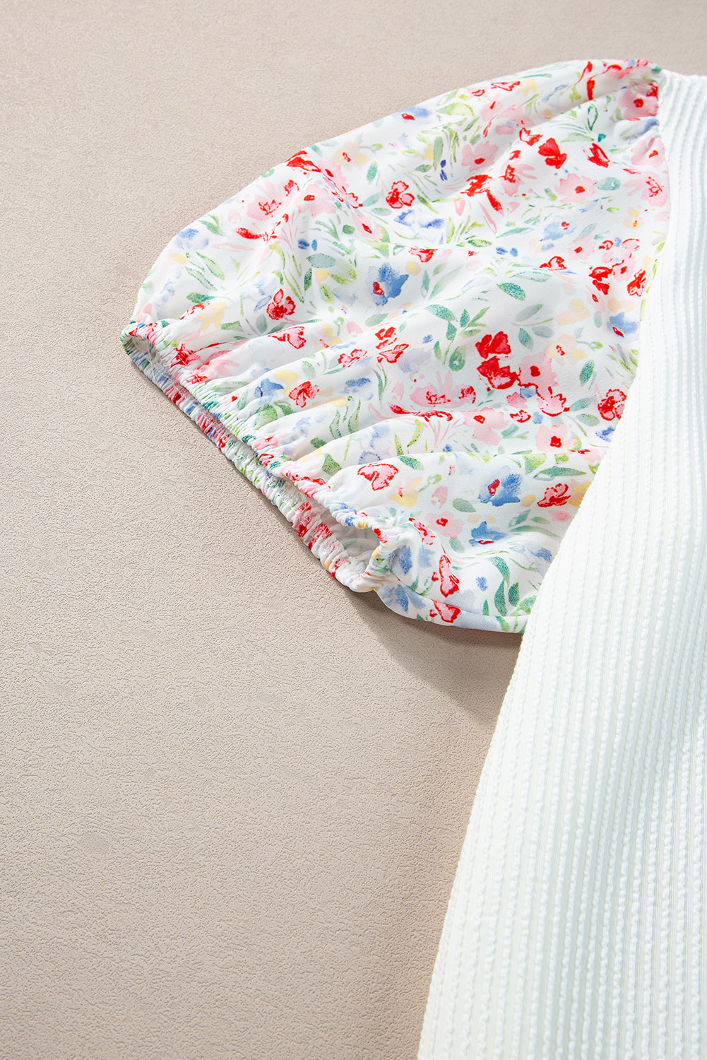Premium Kinslee Contrast Floral Puff Sleeve Ribbed Knit Plus Size Blouse for Women