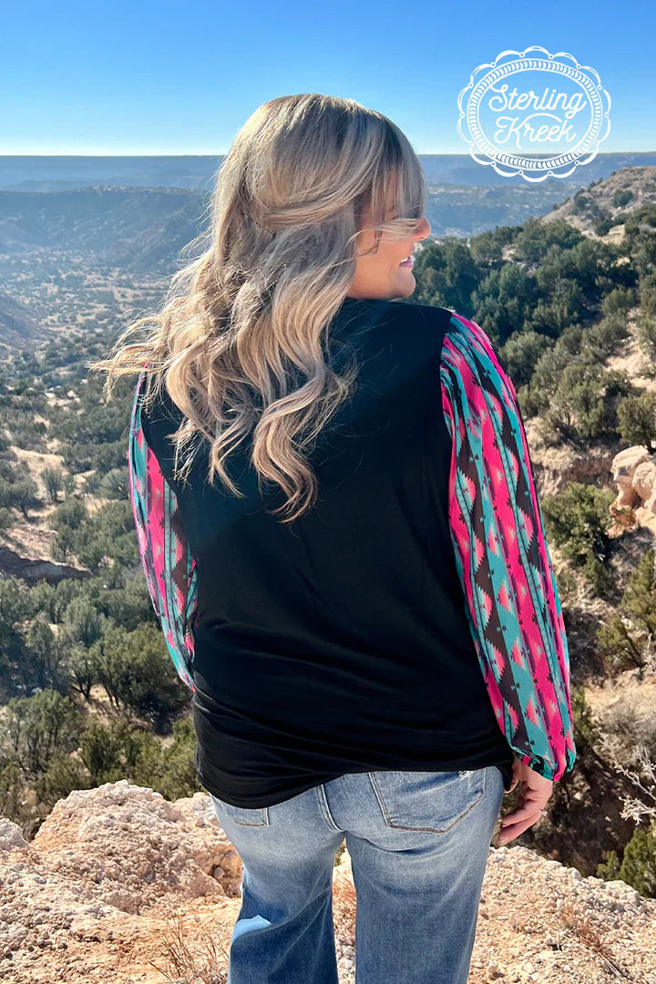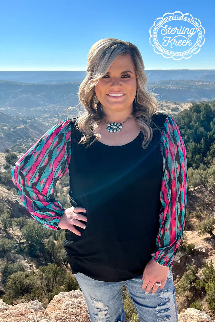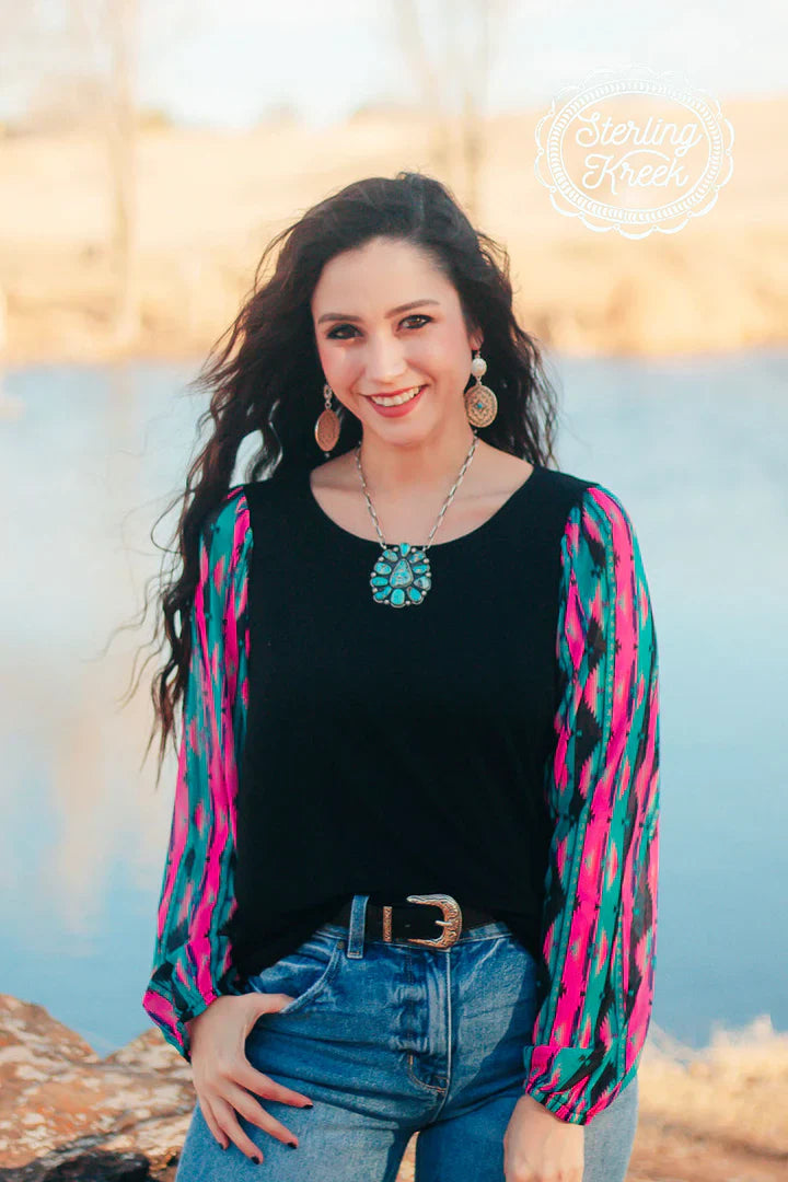 This top is so fun! This is another bubble sleeve with the perfect color combo! The pink, and turquoise pop off the black base! This shirt has the prettiest sheer sleeves and little flare cuffs for a little extra pizzazz! This shirt is so flattering and comfortable! It runs true to size!