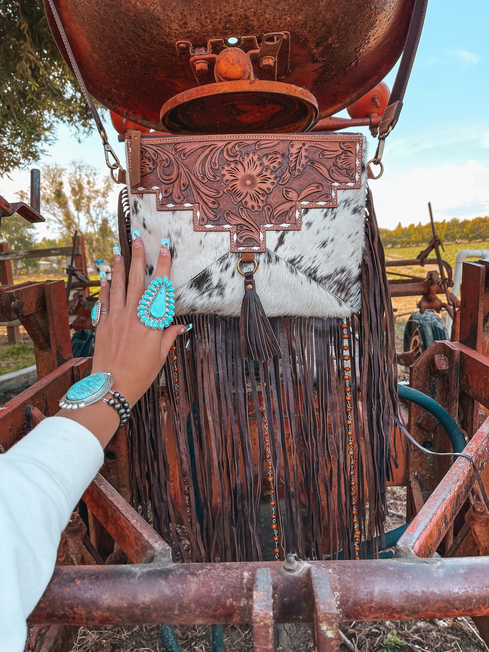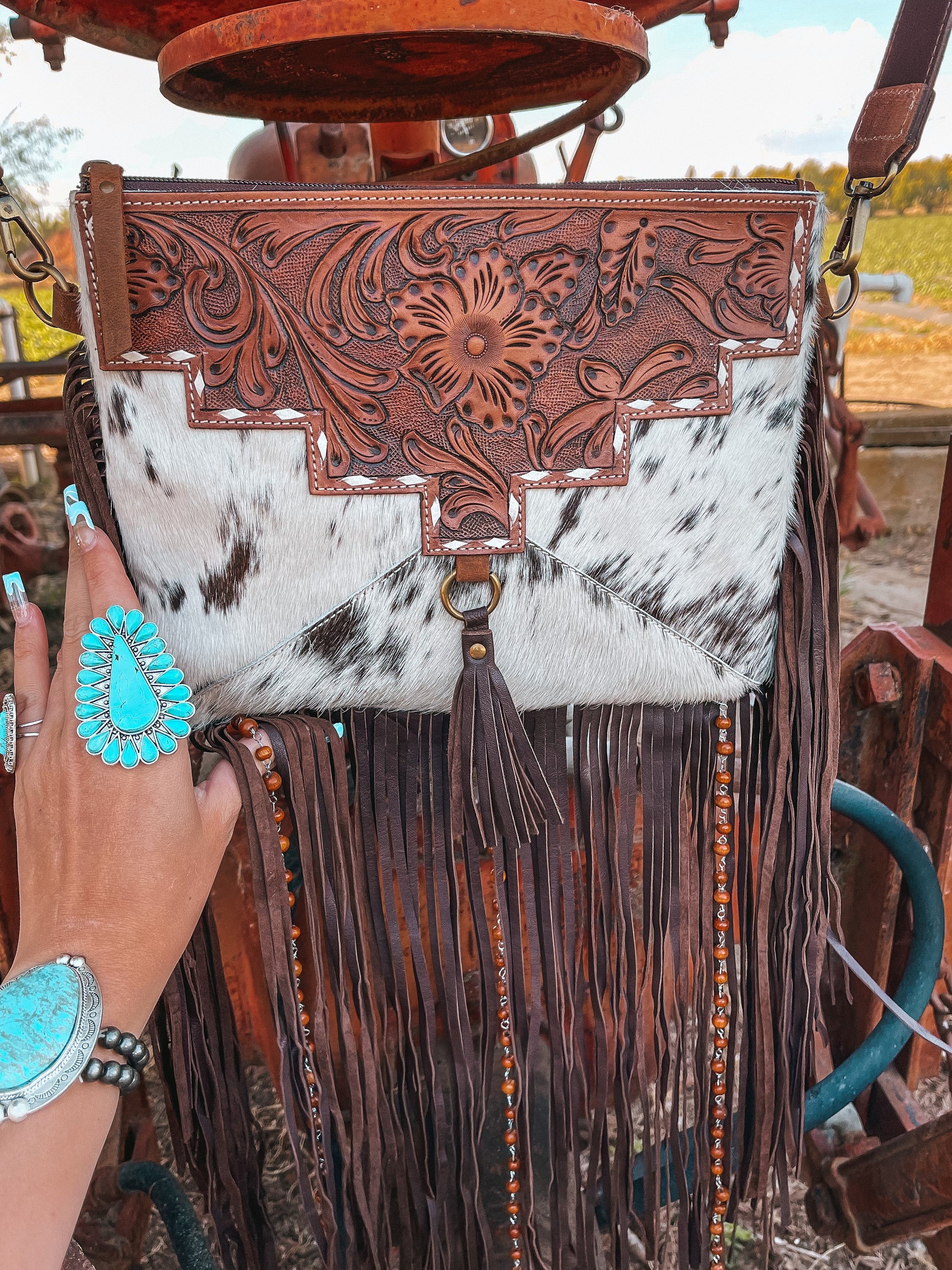 I designed this purse to be used for every moment in life! Whether you are in your everyday outfit, or booking your concert tickets to see your favorite artist, you can be sure that this purse will bring your aesthetic together beautifully. This purse boasts a tooled adjustable and removable strap, and an interior zipper pocket while the purse closes via zipper at the top. Please note every Purse will be one of a kind as each purses made with new unique cowhide pieces.