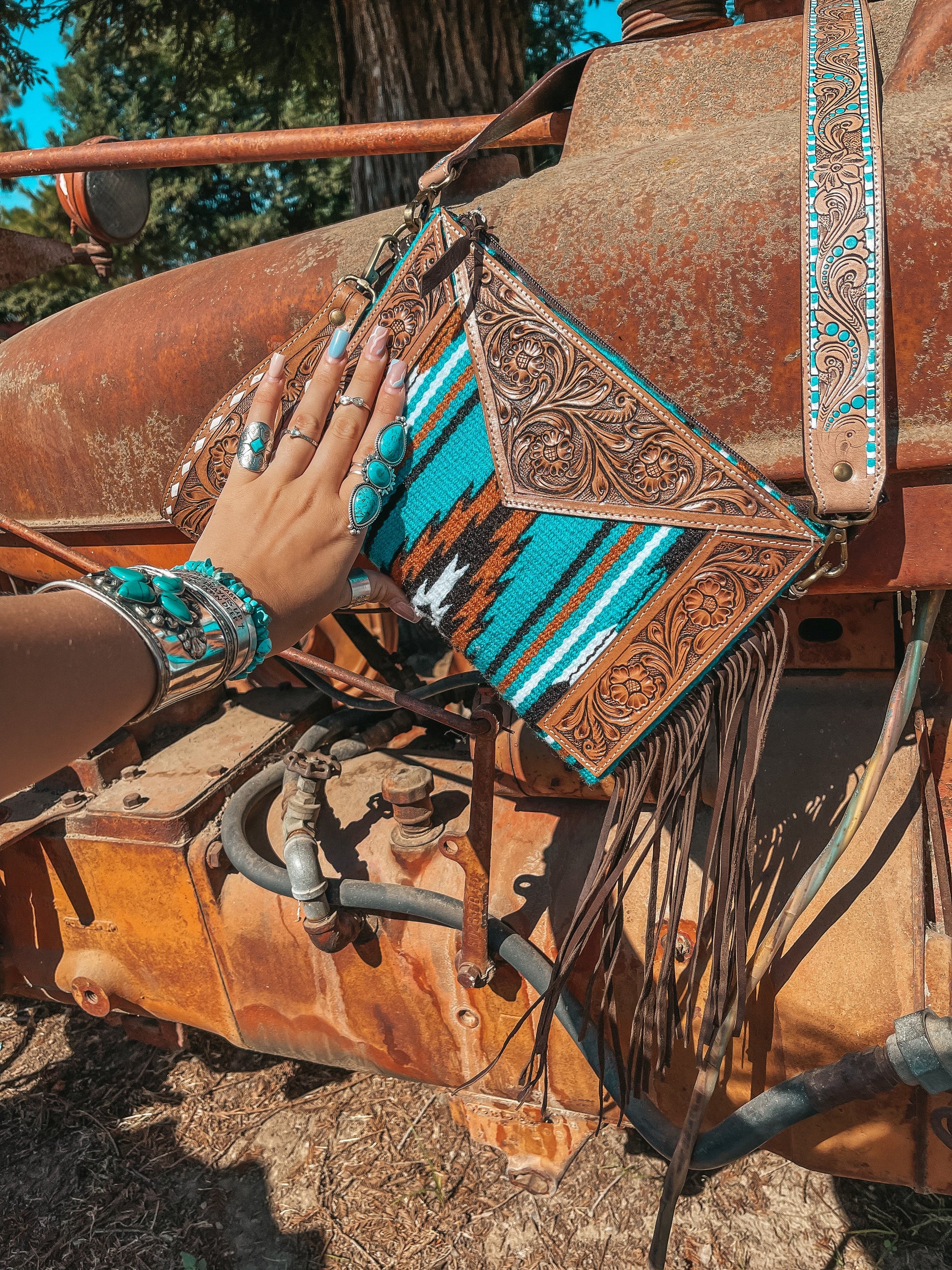 The dimensions are approximately 11.5' x 7.75". There is one zipper pocket inside and the fringe is 12"