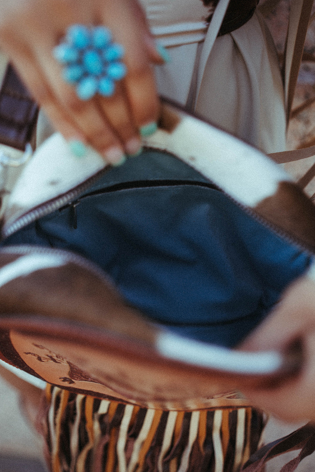 Introducing The Smoking Gun, a Haute Southern Hyde by Beth Marie Exclusive. The canteen shape accentuated with multi-colored fringe has Wild West written all over it. Shes bold, Innocent and yet Shrewd. Dive into Modern Day Western Luxury every time you open your bag and reach in to feel the beautiful Turquoise Velvet. Storage space includes one zippered pocket and one cubby pocket.