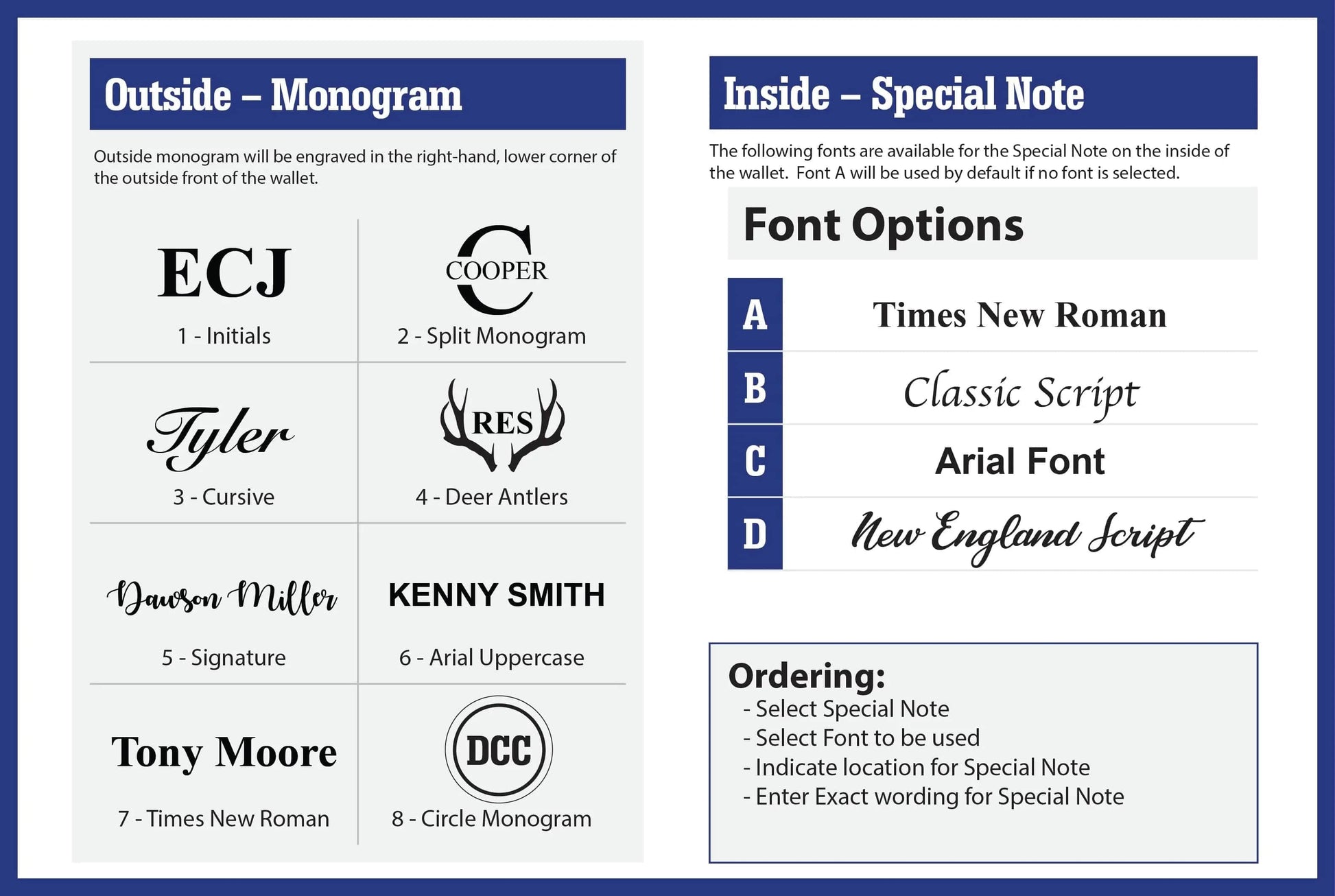 Make it a custom wallet by adding engraved initials to the outside or a personal message to be engraved on the inside.