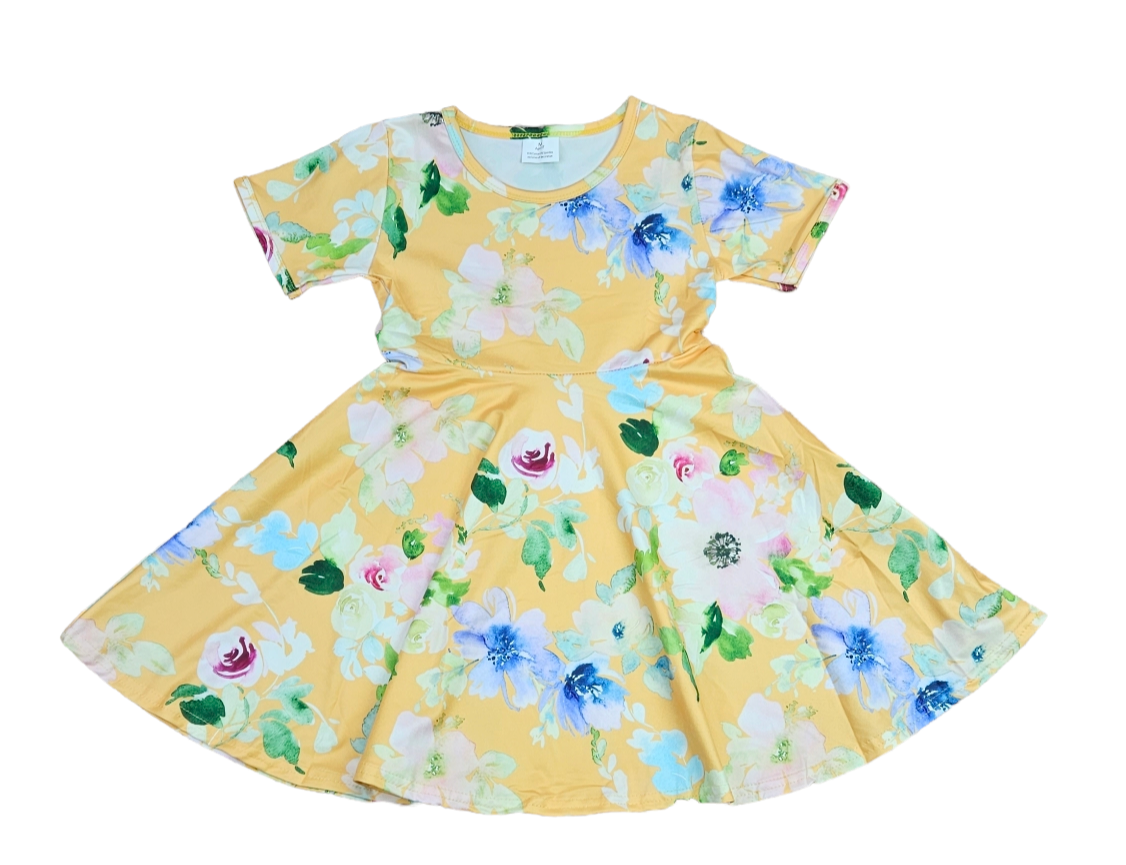Yellow Floral Short Sleeve Milk Silk Twirl Dress